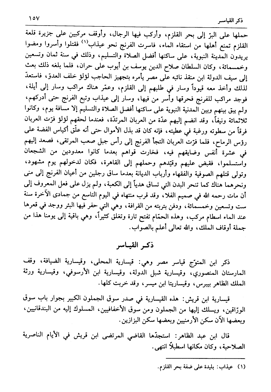 حملها على البرّ إلى بحر القلزم، وأركب فيها الرجال، وأوقف مركبين على جزيرة قلعة القلزم تمنع أهلها من استقاء الماء، فاسرت الفرنج نحو عيذاب «1» فقتلوا وأسروا ومضوا يريدون المدينة النبوية، على ساكنها أفضل الصلاة والتسليم، وذلك في سنة ثمان وتسعين وخمسمائة، وكان السلطان صلاح الدين يوسف بن أيوب على حران، فلما بلغه ذلك بعث إلى سيف الدولة ابن منقذ نائبه على مصر يأمره بتجهيز الحاجب لؤلؤ خلف العدوّ، فاستعدّ لذلك وأخذ معه قيودا وسار في طلبهم إلى القلزم، وعمّر هناك مراكب وسار إلى أيلة، فوجد مراكب للفرنج فحرقها وأسر من فيها، وسار إلى عيذاب وتبع الفرنج حتى أدركهم، ولم يبق بينهم وبين المدينة النبوية على ساكنها أفضل الصلاة والتسليم إلا مسافة يوم، وكانوا ثلاثمائة ونيفا، وقد انضم إليهم عدّة من العربان المرتدّة، فعندما لحقهم لؤلؤ فرّت العربان فرقا من سطوته ورغبة في عطيته، فإنه كان قد بذل الأموال حتى أنه علّق أكياس الفضة على رؤس الرماح، فلما فرّت العربان التجأ الفرنج إلى رأس جبل صعب المرتقى، فصعد إليهم في عشرة أنفس وضايقهم فيه، فخارت قواهم بعد ما كانوا معدودين من الشجعان واستسلموا، فقبض عليهم وقيّدهم وحملهم إلى القاهرة، فكان لدخولهم يوم مشهود، وتولى قتلهم الصوفية والفقهاء وأرباب الديانة بعد ما ساق رجلين من أعيان الفرنج إلى منى ونحرهما هناك كما تنحر البدن التي تساق هديا إلى الكعبة، ولم يزل على فعل المعروف إلى أن مات رحمه الله في صميم الفلا، وقد قرب منتهاه في اليوم التاسع من جمادى الآخرة سنة ست وتسعين وخمسمائة، ودفن بتربته من القرافة، وهي التي حفر فيها البئر ووجد في قعرها عند الماء اسطام مركب، وهذه الحمّام تفتح تارة وتغلق كثيرا، وهي باقية إلى يومنا هذا من جملة أوقاف الملك، والله تعالى أعلم بالصواب.