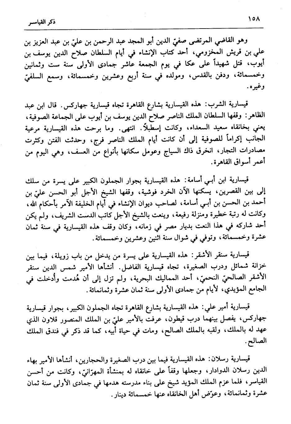 قيسارية سنقر الأشقر: هذه القيسارية على يسرة من يدخل من باب زويلة، فيما بين خزانة شمائل ودرب الصغيرة، تجاه قيسارية الفاضل. أنشأها الأمير شمس الدين سنقر الأشقر الصالحيّ النحميّ، أحد المماليك البحرية، ولم تزل إلى أن هدمت وأدخلت في الجامع المؤيدي، لأيام من جمادى الأولى سنة ثمان عشرة وثمانمائة.