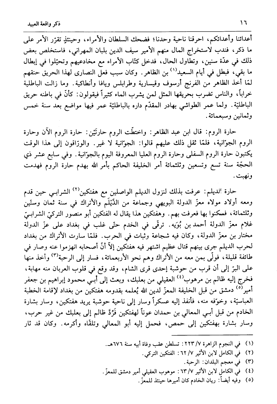 حارة الديلم: عرفت بذلك لنزول الديلم الواصلين مع هفتكين «2» الشرابي حين قدم ومعه أولاد مولاه معزّ الدولة البويهي وجماعة من الدّيلم والأتراك في سنة ثمان وستّين وثلثمائة، فسكنوا بها فعرفت بهم. وهفتكين هذا يقال له الفتكين أبو منصور التركيّ الشرابيّ غلام معزّ الدولة أحمد بن بويه. ترقّى في الخدم حتّى غلب في بغداد على عزّ الدولة مختار بن معزّ الدولة، وكان فيه شجاعة وثبات في الحرب. فلمّا سارت الأتراك من بغداد لحرب الديلم جرى بينهم قتال عظيم اشتهر فيه هفتكين إلّا أنّ أصحابه انهزموا عنه وصار في طائفة قليلة، فولّى بمن معه من الأتراك وهم نحو الأربعمائة، فسار إلى الرحبة «3» وأخذ منها على البرّ إلى أن قرب من حوشبة إحدى قرى الشام، وقد وقع في قلوب العربان منه مهابة، فخرج إليه ظالم بن مرهوب «4» العقيلي من بعلبك، وبعث إلى أبي محمود إبراهيم بن جعفر أمير «5» دمشق من قبل الخليفة المعزّ لدين الله يعلمه بقدومه هفتكين من بغداد لإقامة الخطبة العباسيّة، وخوّفه منه، فأنفذ إليه عسكرا وسار إلى ناحية حوشبة يريد هفتكين، وسار بشارة الخادم من قبل أبي المعالي بن حمدان عونا لهفتكين فردّ ظالم إلى بعلبك من غير حرب، وسار بشارة بهفتكين إلى حمص، فحمل إليه أبو المعالي وتلقّاه وأكرمه. وكان قد ثار