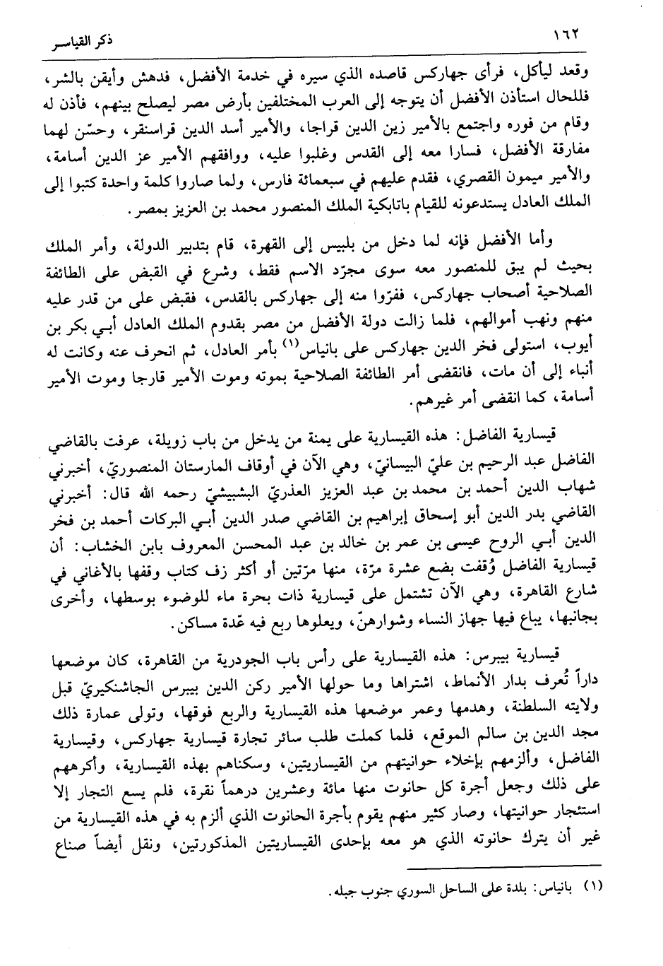 وأما الأفضل فإنه لما دخل من بلبيس إلى القهرة، قام بتدبير الدولة، وأمر الملك بحيث لم يبق للمنصور معه سوى مجرّد الاسم فقط، وشرع في القبض على الطائفة الصلاحية أصحاب جهاركس، ففرّوا منه إلى جهاركس بالقدس، فقبض على من قدر عليه منهم ونهب أموالهم، فلما زالت دولة الأفضل من مصر بقدوم الملك العادل أبي بكر بن أيوب، استولى فخر الدين جهاركس على بانياس «1» بأمر العادل، ثم انحرف عنه وكانت له أنباء إلى أن مات، فانقضى أمر الطائفة الصلاحية بموته وموت الأمير قارجا وموت الأمير أسامة، كما انقضى أمر غيرهم.
