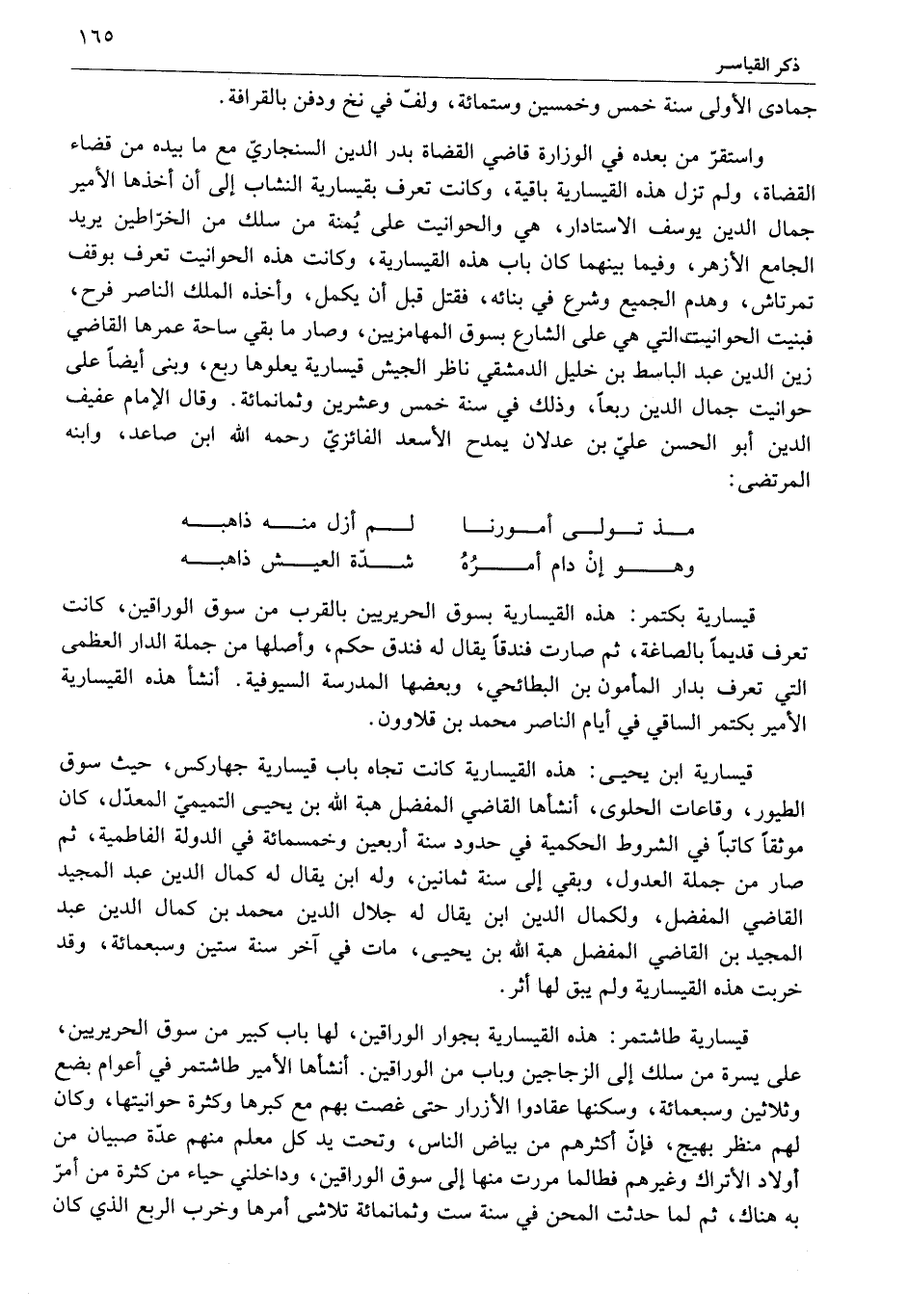 واستقرّ من بعده في الوزارة قاضي القضاة بدر الدين السنجاريّ مع ما بيده من قضاء القضاة، ولم تزل هذه القيسارية باقية، وكانت تعرف بقيسارية النشاب إلى أن أخذها الأمير جمال الدين يوسف الاستادار، هي والحوانيت على يمنة من سلك من الخرّاطين يريد الجامع الأزهر، وفيما بينهما كان باب هذه القيسارية، وكانت هذه الحوانيت تعرف بوقف تمرتاش، وهدم الجميع وشرع في بنائه، فقتل قبل أن يكمل، وأخذه الملك الناصر فرح، فبنيت الحوانيت التي هي على الشارع بسوق المهامزيين، وصار ما بقي ساحة عمرها القاضي زين الدين عبد الباسط بن خليل الدمشقي ناظر الجيش قيسارية يعلوها ربع، وبنى أيضا على حوانيت جمال الدين ربعا، وذلك في سنة خمس وعشرين وثمانمائة. وقال الإمام عفيف الدين أبو الحسن عليّ بن عدلان يمدح الأسعد الفائزيّ رحمه الله ابن صاعد، وابنه المرتضى: