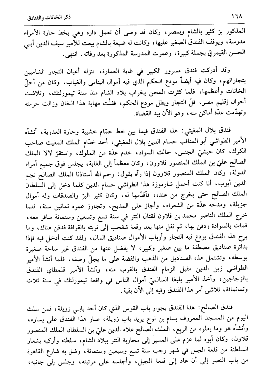 فندق الصالح: هذا الفندق بجوار باب القوس الذي كان أحد بابي زويلة، فمن سلك اليوم من المسجد المعروف بسام بن نوح يريد باب زويلة، صار هذا الفندق على يساره، وأنشأه هو وما يعلوه من الربع، الملك الصالح علاء الدين عليّ بن السلطان الملك المنصور قلاون، وكان أبوه لما عزم على المسير إلى محاربة التتر ببلاد الشام، سلطنه وأركبه بشعار السلطنة من قلعة الجبل في شهر رجب سنة تسع وسبعين وستمائة، وشق به شارع القاهرة من باب النصر إلى أن عاد إلى قلعة الجبل، وأجلسه على مرتبته، وجلس إلى جانبه،