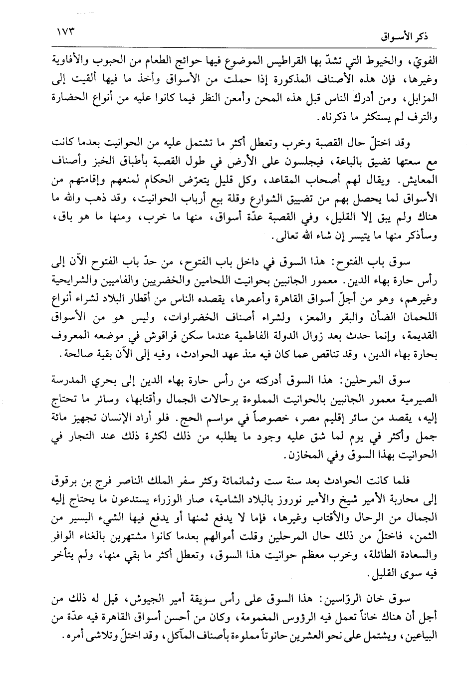 سوق باب الفتوح: هذا السوق في داخل باب الفتوح، من حدّ باب الفتوح الآن إلى رأس حارة بهاء الدين. معمور الجانبين بحوانيت اللحامين والخضريين والفاميين والشرايحية وغيرهم، وهو من أجلّ أسواق القاهرة وأعمرها، يقصده الناس من أقطار البلاد لشراء أنواع اللحمان الضأن والبقر والمعز، ولشراء أصناف الخضراوات، وليس هو من الأسواق القديمة، وإنما حدث بعد زوال الدولة الفاطمية عند ما سكن قراقوش في موضعه المعروف بحارة بهاء الدين، وقد تناقص عما كان فيه منذ عهد الحوادث، وفيه إلى الآن بقية صالحة.