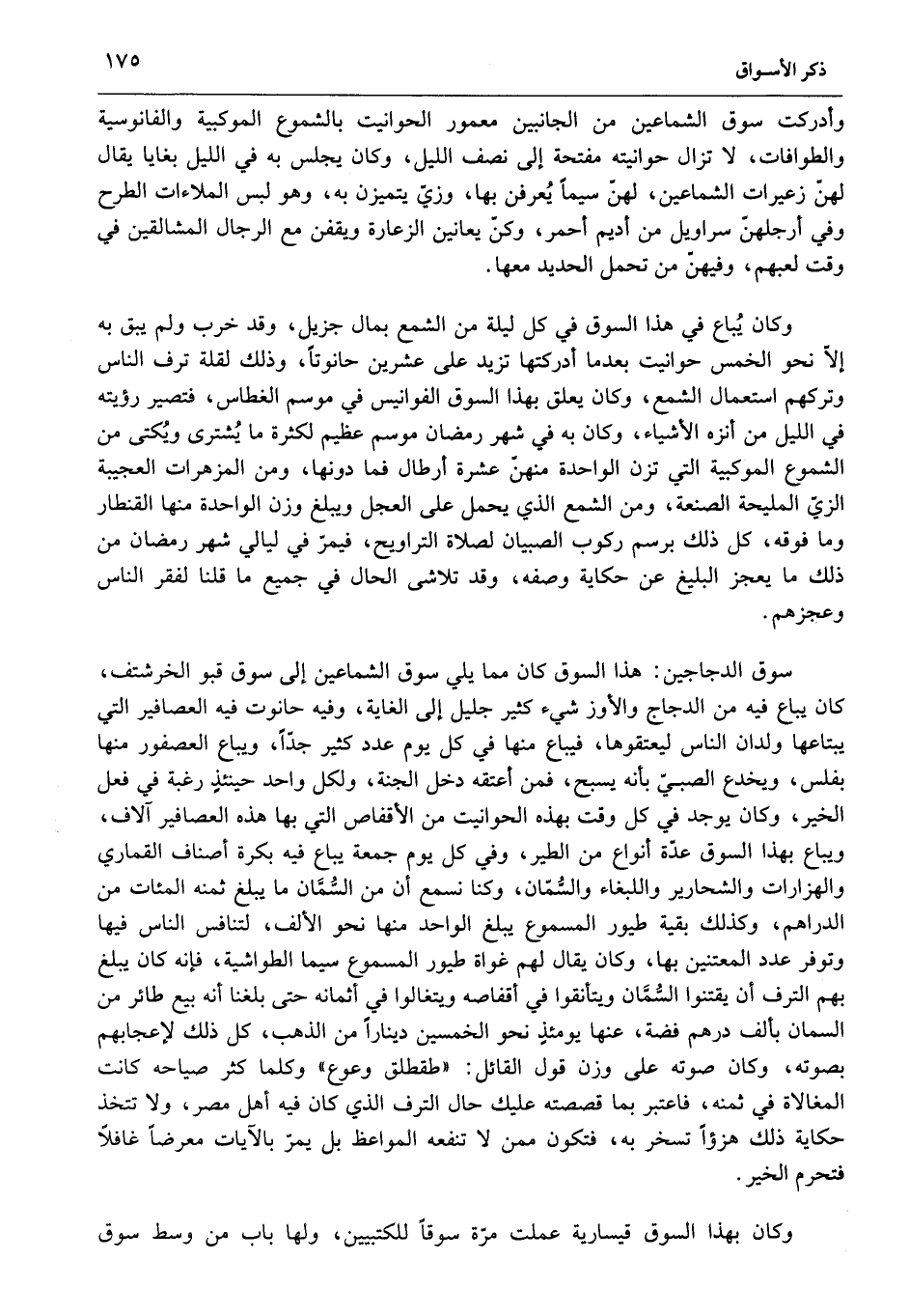 وكان يباع في هذا السوق في كل ليلة من الشمع بمال جزيل، وقد خرب ولم يبق به إلّا نحو الخمس حوانيت بعد ما أدركتها تزيد على عشرين حانوتا، وذلك لقلة ترف الناس وتركهم استعمال الشمع، وكان يعلق بهذا السوق الفوانيس في موسم الغطاس، فتصير رؤيته في الليل من أنزه الأشياء، وكان به في شهر رمضان موسم عظيم لكثرة ما يشترى ويكتى من الشموع الموكبية التي تزن الواحدة منهنّ عشرة أرطال فما دونها، ومن المزهرات العجيبة الزيّ المليحة الصنعة، ومن الشمع الذي يحمل على العجل ويبلغ وزن الواحدة منها القنطار وما فوقه، كل ذلك برسم ركوب الصبيان لصلاة التراويح، فيمرّ في ليالي شهر رمضان من ذلك ما يعجز البليغ عن حكاية وصفه، وقد تلاشى الحال في جميع ما قلنا لفقر الناس وعجزهم.
