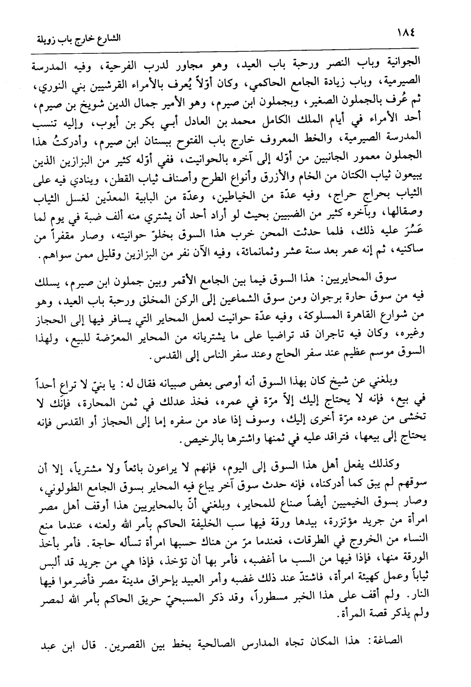 وكذلك يفعل أهل هذا السوق إلى اليوم، فإنهم لا يراعون بائعا ولا مشتريا، إلا أن سوقهم لم يبق كما أدركناه، فإنه حدث سوق آخر يباع فيه المحاير بسوق الجامع الطولوني، وصار بسوق الخيميين أيضا صناع للمحاير، وبلغني أنّ بالمحايريين هذا أوقف أهل مصر امرأة من جريد مؤتزرة، بيدها ورقة فيها سب الخليفة الحاكم بأمر الله ولعنه، عندما منع النساء من الخروج في الطرقات، فعندما مرّ من هناك حسبها امرأة تسأله حاجة. فأمر بأخذ الورقة منها، فإذا فيها من السب ما أغضبه، فأمر بها أن تؤخذ، فإذا هي من جريد قد ألبس ثيابا وعمل كهيئة امرأة، فاشتدّ عند ذلك غضبه وأمر العبيد بإحراق مدينة مصر فأضرموا فيها النار. ولم أقف على هذا الخبر مسطورا، وقد ذكر المسبحيّ حريق الحاكم بأمر الله لمصر ولم يذكر قصة المرأة.