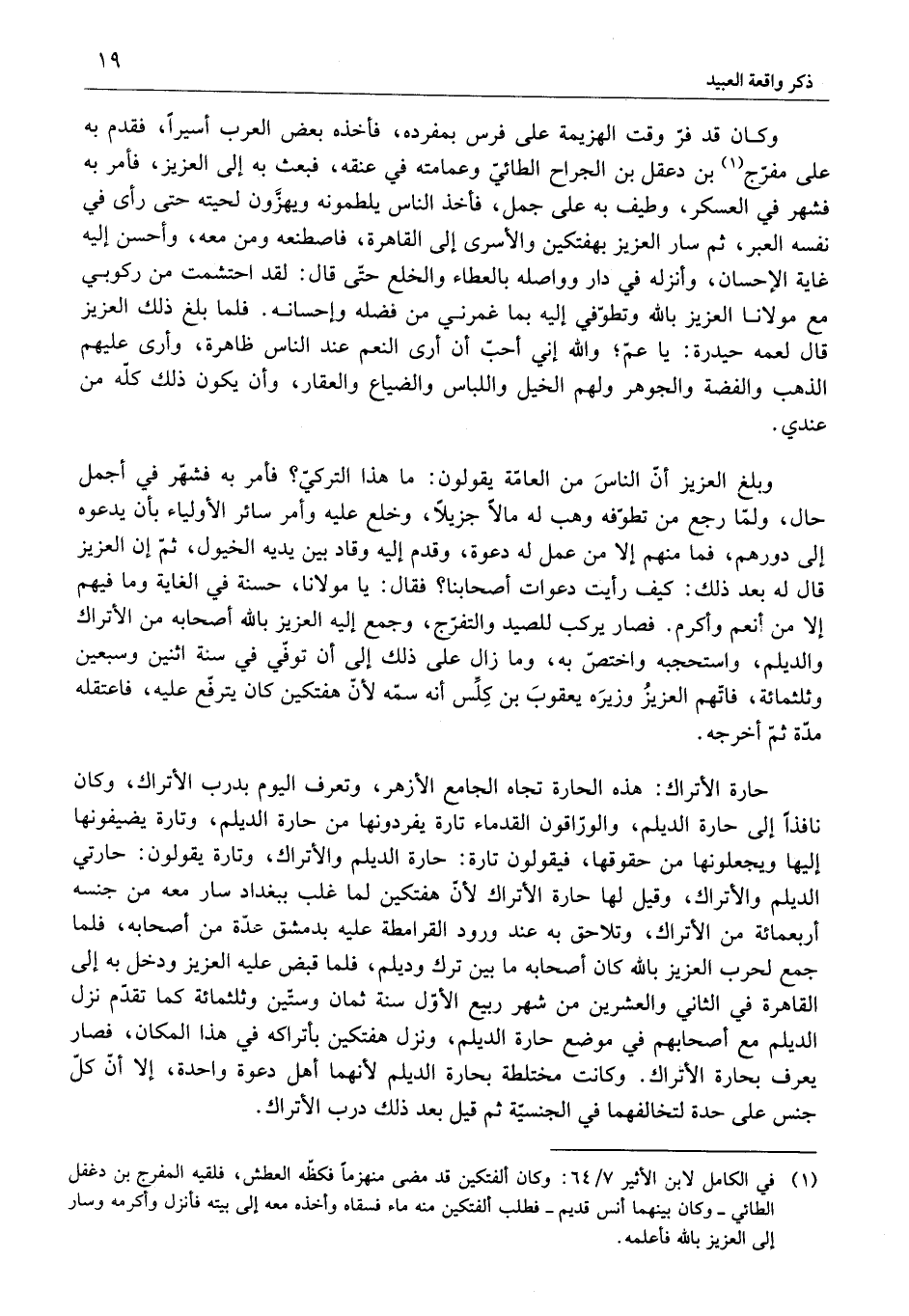 وكان قد فرّ وقت الهزيمة على فرس بمفرده، فأخذه بعض العرب أسيرا، فقدم به على مفرّج «1» بن دعقل بن الجراح الطائيّ وعمامته في عنقه، فبعث به إلى العزيز، فأمر به فشهر في العسكر، وطيف به على جمل، فأخذ الناس يلطمونه ويهزّون لحيته حتى رأى في نفسه العبر، ثم سار العزيز بهفتكين والأسرى إلى القاهرة، فاصطنعه ومن معه، وأحسن إليه غاية الإحسان، وأنزله في دار وواصله بالعطاء والخلع حتّى قال: لقد احتشمت من ركوبي مع مولانا العزيز بالله وتطوّفي إليه بما غمرني من فضله وإحسانه. فلما بلغ ذلك العزيز قال لعمه حيدرة: يا عمّ؛ والله إني أحبّ أن أرى النعم عند الناس ظاهرة، وأرى عليهم الذهب والفضة والجوهر ولهم الخيل واللباس والضياع والعقار، وأن يكون ذلك كلّه من عندي.
