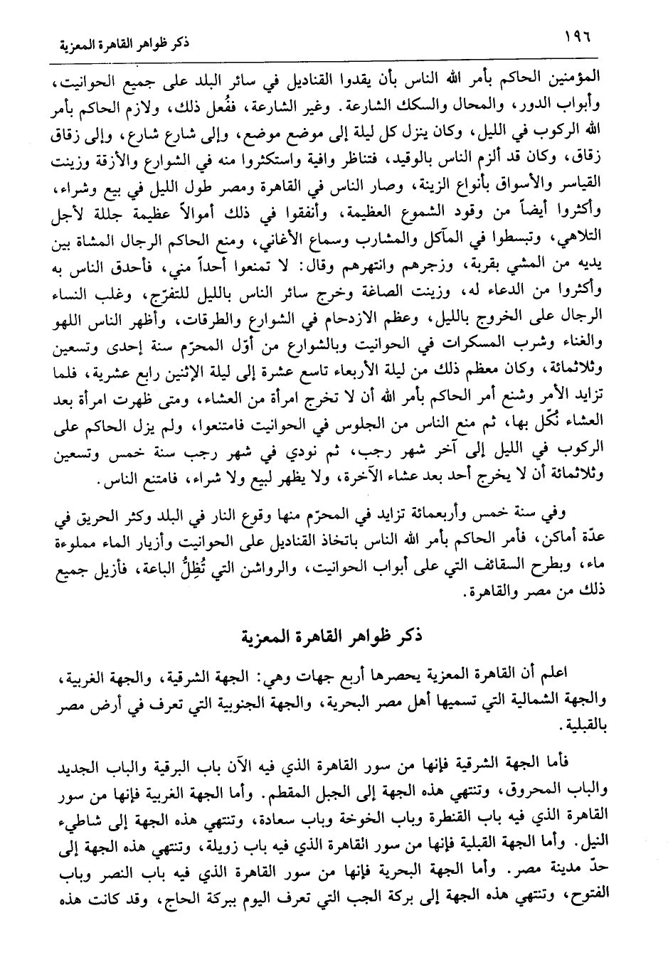 اعلم أن القاهرة المعزية يحصرها أربع جهات وهي: الجهة الشرقية، والجهة الغربية، والجهة الشمالية التي تسميها أهل مصر البحرية، والجهة الجنوبية التي تعرف في أرض مصر بالقبلية.