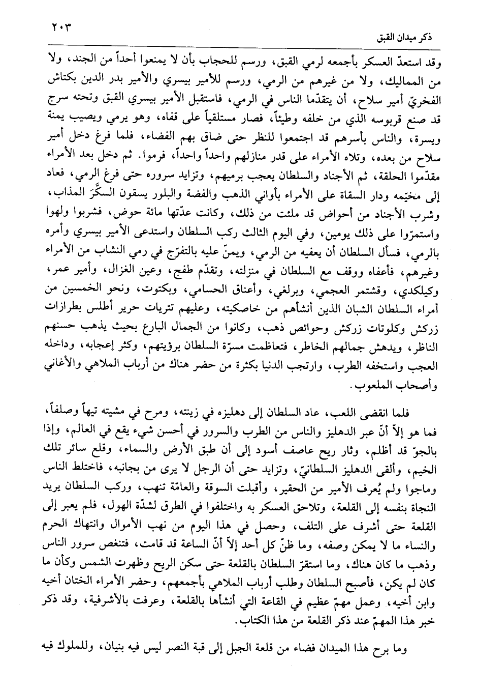 وقد استعدّ العسكر بأجمعه لرمي القبق، ورسم للحجاب بأن لا يمنعوا أحدا من الجند، ولا من المماليك، ولا من غيرهم من الرمي، ورسم للأمير بيسري والأمير بدر الدين بكتاش الفخريّ أمير سلاح، أن يتقدّما الناس في الرمي، فاستقبل الأمير بيسري القبق وتحته سرج قد صنع قربوسه الذي من خلفه وطيئا، فصار مستلقيا على قفاه، وهو يرمي ويصيب يمنة ويسرة، والناس بأسرهم قد اجتمعوا للنظر حتى ضاق بهم الفضاء، فلما فرغ دخل أمير سلاح من بعده، وتلاه الأمراء على قدر منازلهم واحدا واحدا، فرموا. ثم دخل بعد الأمراء مقدّموا الحلقة، ثم الأجناد والسلطان يعجب برميهم، وتزايد سروره حتى فرغ الرمي، فعاد إلى مخيّمه ودار السقاة على الأمراء بأواني الذهب والفضة والبلور يسقون السكّر المذاب، وشرب الأجناد من أحواض قد ملئت من ذلك، وكانت عدّتها مائة حوض، فشربوا ولهوا واستمرّوا على ذلك يومين، وفي اليوم الثالث ركب السلطان واستدعى الأمير بيسري وأمره بالرمي، فسأل السلطان أن يعفيه من الرمي، ويمنّ عليه بالتفرّج في رمي النشاب من الأمراء وغيرهم، فأعفاه ووقف مع السلطان في منزلته، وتقدّم طفج، وعين الغزال، وأمير عمر، وكيلكدي، وقشتمر العجمي، وبرلغي، وأعناق الحسامي، وبكتوت، ونحو الخمسين من أمراء السلطان الشبان الذين أنشأهم من خاصكيته، وعليهم تتريات حرير أطلس بطرازات زركش وكلوتات زركش وحوائص ذهب، وكانوا من الجمال البارع بحيث يذهب حسنهم الناظر، ويدهش جمالهم الخاطر، فتعاظمت مسرّة السلطان برؤيتهم، وكثر إعجابه، وداخله العجب واستخفه الطرب، وارتجب الدنيا بكثرة من حضر هناك من أرباب الملاهي والأغاني وأصحاب الملعوب.