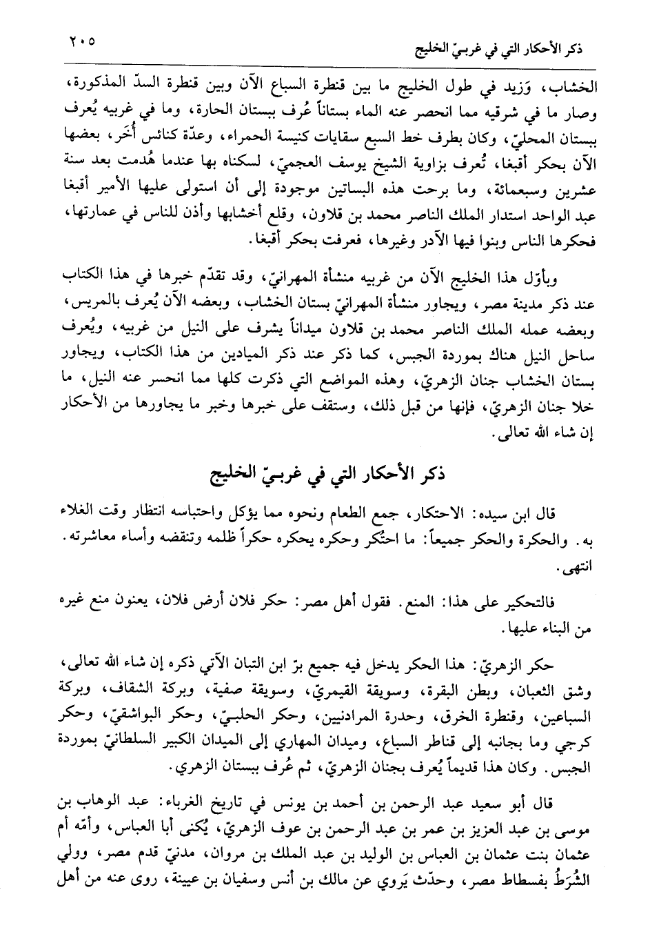 الخشاب، وزيد في طول الخليج ما بين قنطرة السباع الآن وبين قنطرة السدّ المذكورة، وصار ما في شرقيه مما انحصر عنه الماء بستانا عرف ببستان الحارة، وما في غربيه يعرف ببستان المحليّ، وكان بطرف خط السبع سقايات كنيسة الحمراء، وعدّة كنائس أخر، بعضها الآن بحكر أقبغا، تعرف بزاوية الشيخ يوسف العجميّ، لسكناه بها عند ما هدمت بعد سنة عشرين وسبعمائة، وما برحت هذه البساتين موجودة إلى أن استولى عليها الأمير أقبغا عبد الواحد استدار الملك الناصر محمد بن قلاون، وقلع أخشابها وأذن للناس في عمارتها، فحكرها الناس وبنوا فيها الآدر وغيرها، فعرفت بحكر أقبغا.