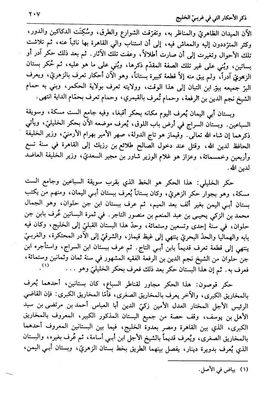 الآن الميدان الظاهريّ والمناظر به، وتفرّقت الشوارع والطرق، وسكنت الدكاكين والدور، وكثر المترّددون إليه والمعاش فيه، إلى أن استناب والي القاهرة بها نائبا عنه، ثم تلاشت تلك الأحوال وتغيرت إلى أن صارت أطلالا، وعفت تلك الآثار. ثم بعد ذلك حكر آدر أو بساتين، وبني على غير تلك الصفة المقدّم ذكرها، وبني على ما هو عليه، ثم حكر بستان الزهريّ آدرا، ولم يبق منه إلّا قطعة كبيرة بستانا، وهو الآن أحكار تعرف بالزهريّ، ويعرف البرّ جميعه ببرّ ابن التبان إلى هذا الوقت، وولايته تعرف بولاية الحكمر، وبني به حمام الشيخ نجم الدين بن الرفعة، وحمام تعرف بالقيمري، وحمام تعرف بحمّام الداية انتهى.