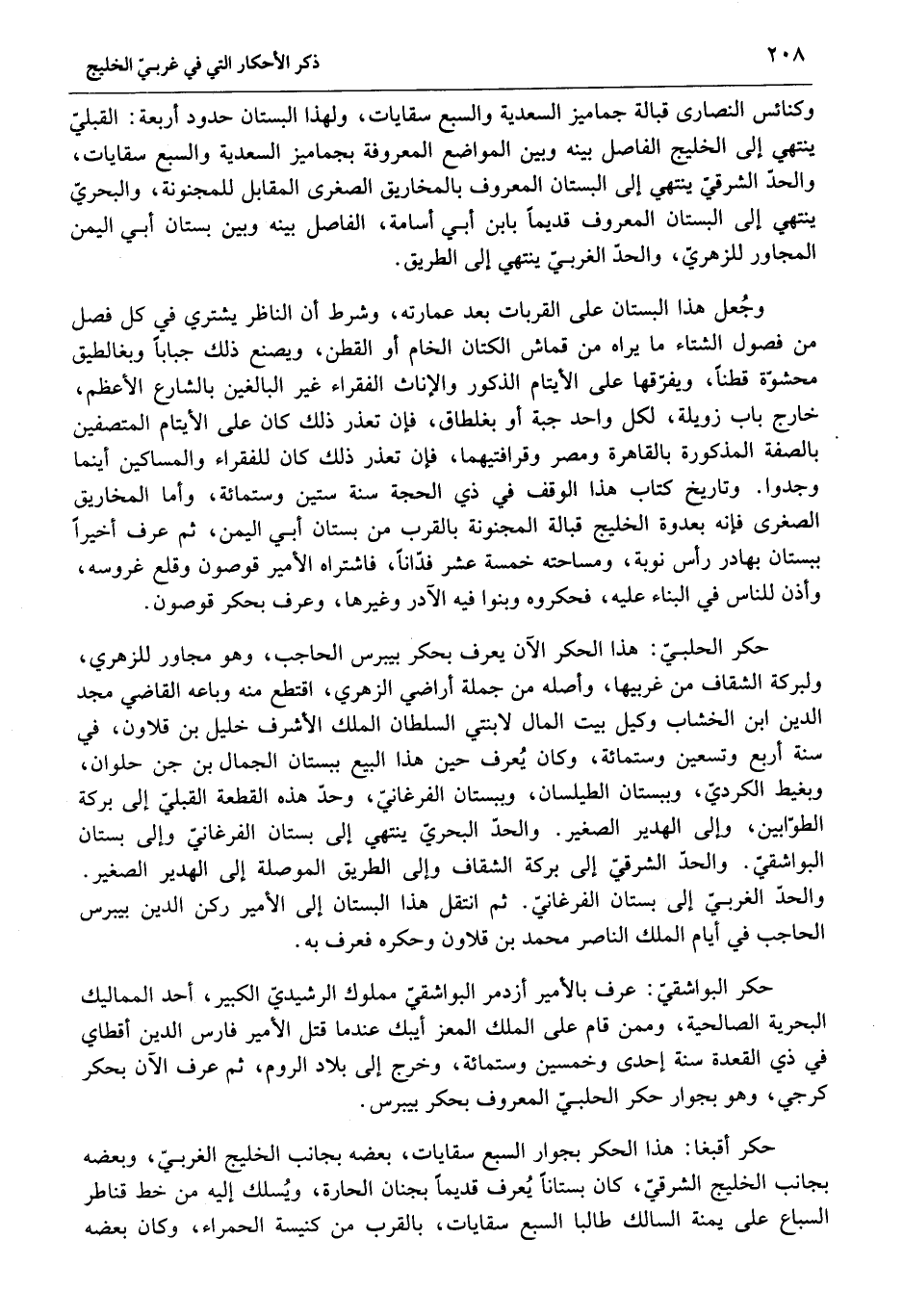 والحدّ الغربيّ إلى بستان الفرغانيّ. ثم انتقل هذا البستان إلى الأمير ركن الدين بيبرس الحاجب في أيام الملك الناصر محمد بن قلاون وحكره فعرف به.