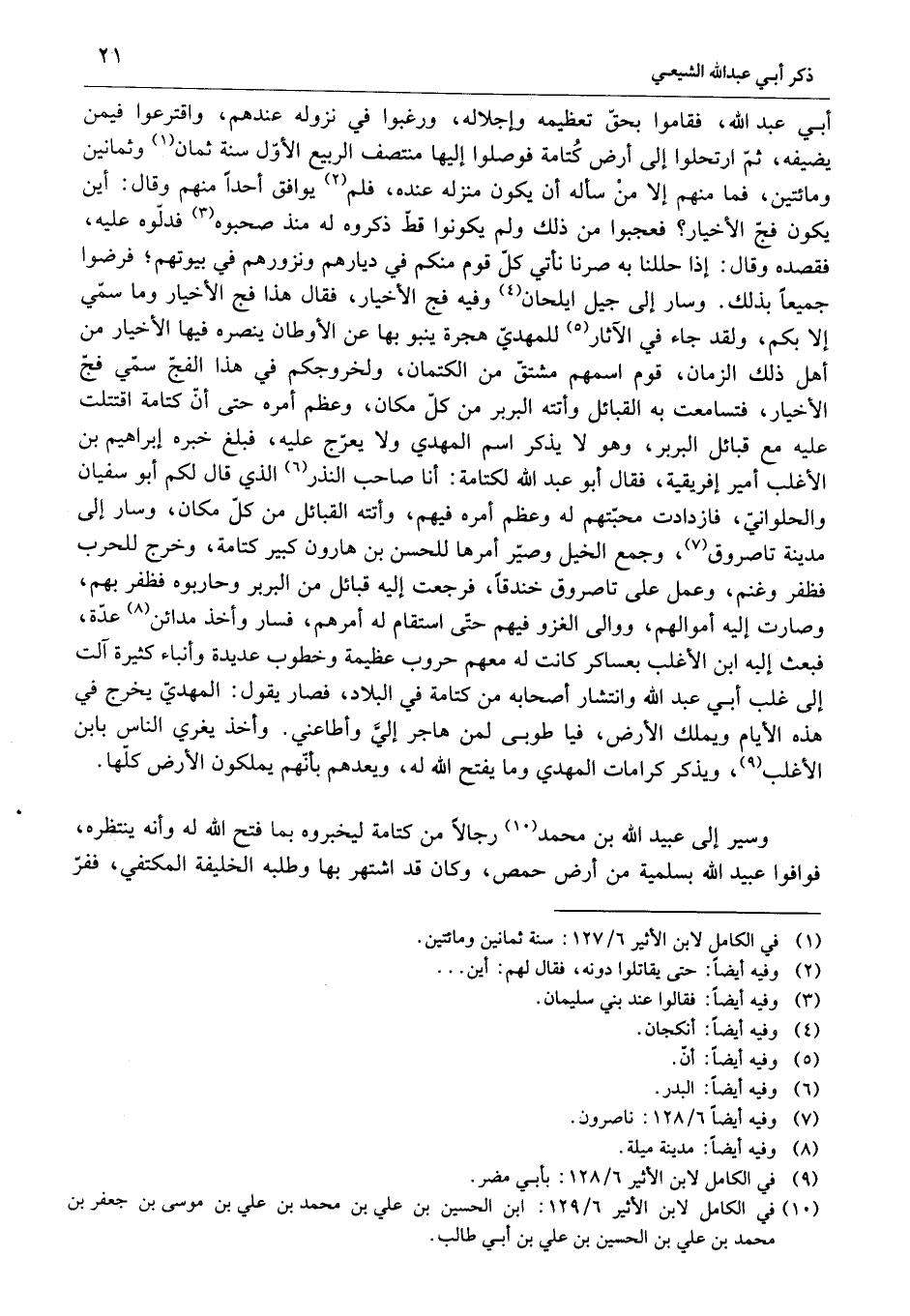 وسير إلى عبيد الله بن محمد «10» رجالا من كتامة ليخبروه بما فتح الله له وأنه ينتظره، فوافوا عبيد الله بسلمية من أرض حمص، وكان قد اشتهر بها وطلبه الخليفة المكتفي، ففرّ
