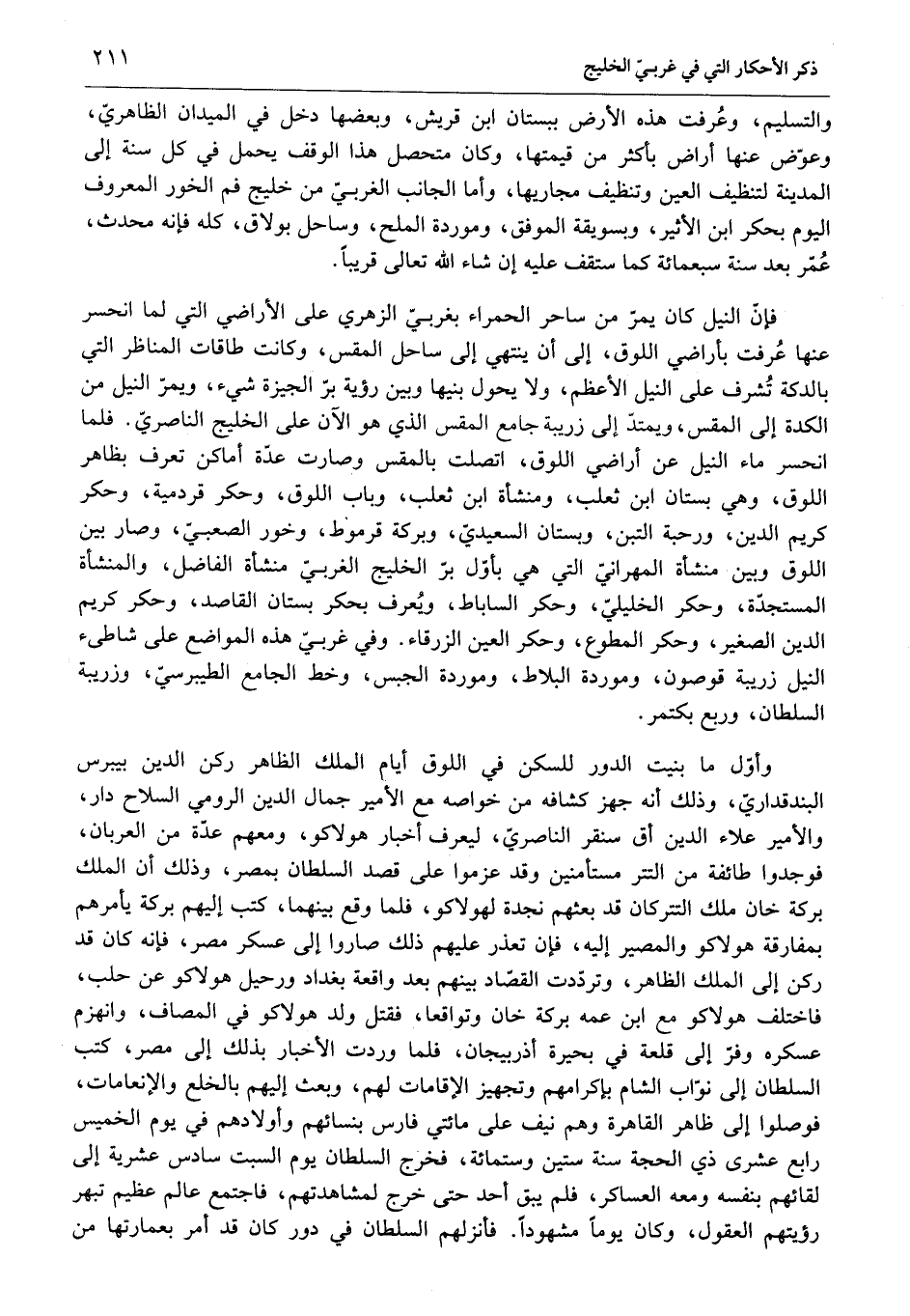 والتسليم، وعرفت هذه الأرض ببستان ابن قريش، وبعضها دخل في الميدان الظاهريّ، وعوّض عنها أراض بأكثر من قيمتها، وكان متحصل هذا الوقف يحمل في كل سنة إلى المدينة لتنظيف العين وتنظيف مجاريها، وأما الجانب الغربيّ من خليج فم الخور المعروف اليوم بحكر ابن الأثير، وبسويقة الموفق، وموردة الملح، وساحل بولاق، كله فإنه محدث، عمّر بعد سنة سبعمائة كما ستقف عليه إن شاء الله تعالى قريبا.