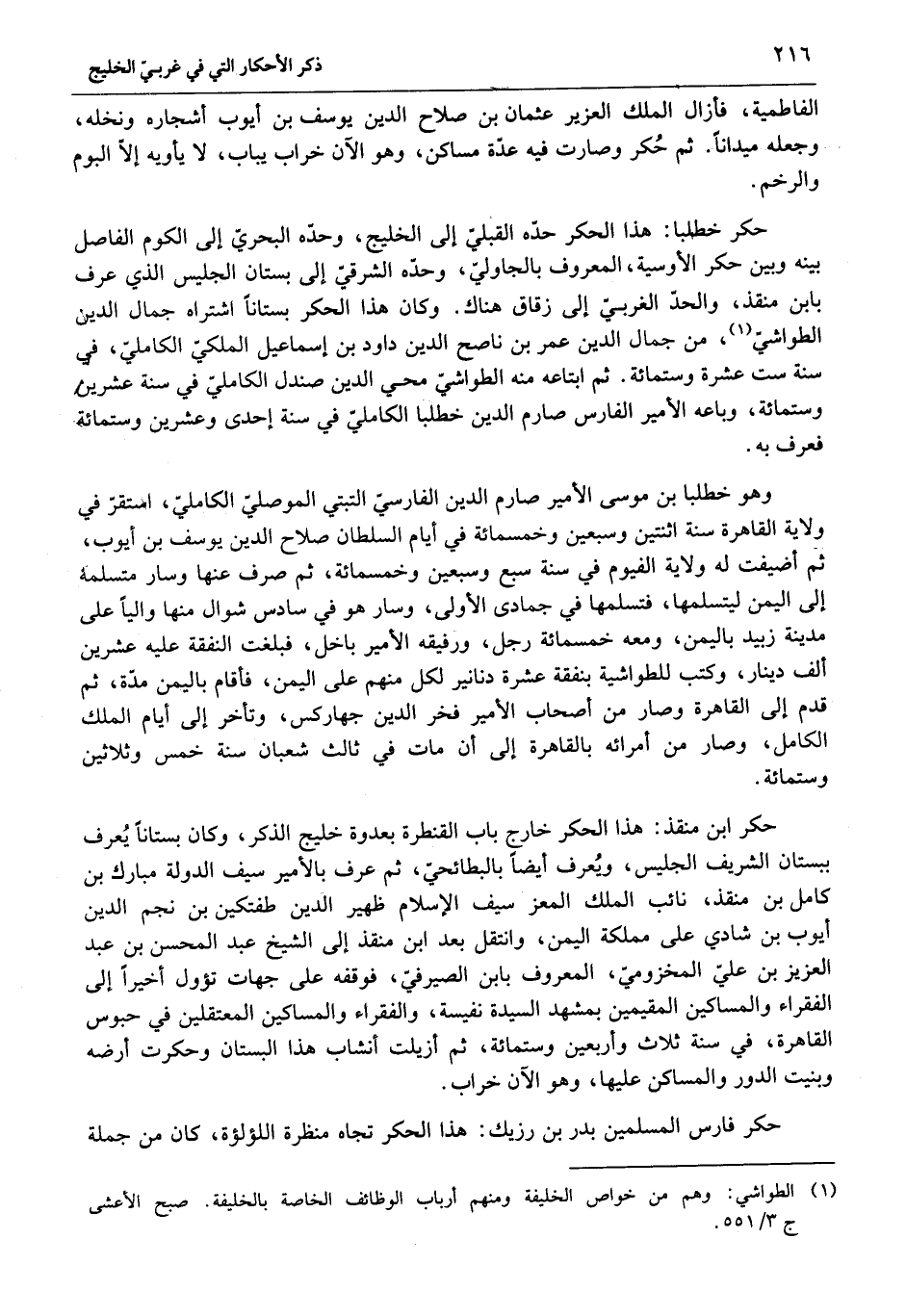 الفاطمية، فأزال الملك العزيز عثمان بن صلاح الدين يوسف بن أيوب أشجاره ونخله، وجعله ميدانا. ثم حكر وصارت فيه عدّة مساكن، وهو الآن خراب يباب، لا يأويه إلّا البوم والرخم.