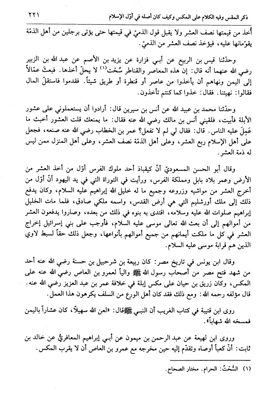 وحدّثنا محمد بن عبيد الله عن أنس بن سيرين قال: أرادوا أن يستعملوني على عشور الأبلة فأبيت، فلقيني أنس بن مالك رضي الله عنه فقال: ما يمنعك قلت العشور أخبث ما عمل عليه الناس. قال: فقال لي لم لا تفعل؟ عمر بن الخطاب رضي الله عنه صنعه، فجعل على أهل الإسلام ربع العشر، وعلى أهل الذمّة نصف العشر، وعلى أهل المنزل ممن ليس له ذمة العشر.