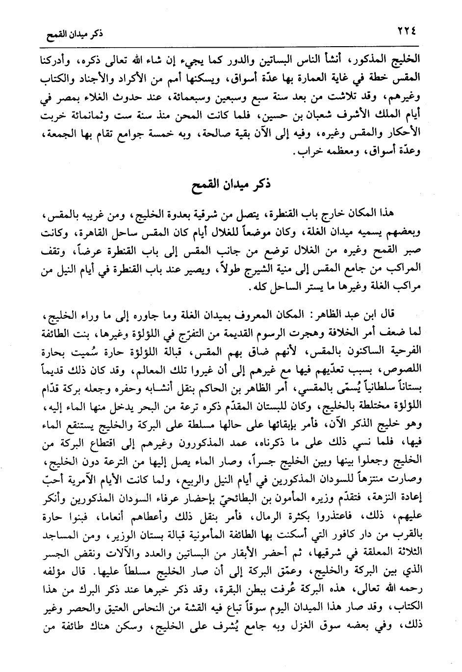 الخليج المذكور، أنشأ الناس البساتين والدور كما يجيء إن شاء الله تعالى ذكره، وأدركنا المقس خطة في غاية العمارة بها عدّة أسواق، ويسكنها أمم من الأكراد والأجناد والكتاب وغيرهم، وقد تلاشت من بعد سنة سبع وسبعين وسبعمائة، عند حدوث الغلاء بمصر في أيام الملك الأشرف شعبان بن حسين، فلما كانت المحن منذ سنة ست وثمانمائة خربت الأحكار والمقس وغيره، وفيه إلى الآن بقية صالحة، وبه خمسة جوامع تقام بها الجمعة، وعدّة أسواق، ومعظمه خراب.