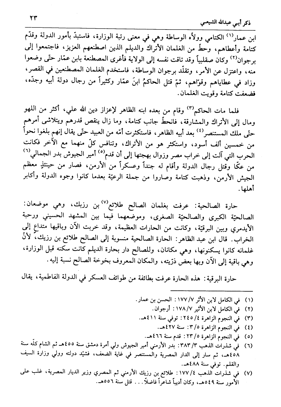 فلما مات الحاكم «3» وقام من بعده ابنه الظاهر لإعزاز دين الله علي، أكثر من اللهو ومال إلى الأتراك والمشارقة، فانحطّ جانب كتامة، وما زال ينقص قدرهم ويتلاشى أمرهم حتّى ملك المستنصر «4» بعد أبيه الظاهر، فاستكثرت أمّه من العبيد حتّى يقال إنهم بلغوا نحوا من خمسين ألف أسود، واستكثر هو من الأتراك، وتنافس كلّ منهما مع الآخر فكانت الحرب التي آلت إلى خراب مصر وزوال بهجتها إلى أن قدم «5» أمير الجيوش بدر الجمالي «6» من عكّا وقتل رجال الدولة وأقام له جندا وعسكرا من الأرمن، فصار من حينئذ معظم الجيش الأرمن، وذهبت كتامة وصاروا من جملة الرعيّة بعد ما كانوا وجوه الدولة وأكابر أهلها.