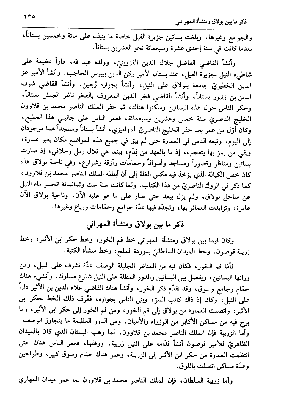 وأنشأ القاضي الفاضل جلال الدين القزوينيّ، وولده عبد الله، دارا عظيمة على شاطيء النيل بجزيرة الفيل، عند بستان الأمير ركن الدين بيبرس الحاجب. وأنشأ الأمير عز الدين الخطيريّ جامعة ببولاق على النيل، وأنشأ بجواره ربعين. وأنشأ القاضي شرف الدين بن زنبور بستانا، وأنشأ القاضي فخر الدين المعروف بالفخر ناظر الجيش بستانا، وحكر الناس حول هذه البساتين وسكنوا هناك، ثم حفر الملك الناصر محمد بن قلاوون الخليج الناصريّ سنة خمس وعشرين وسبعمائة، فعمر الناس على جانبي هذا الخليج، وكان أوّل من عمر بعد حفر الخليج الناصريّ المهاميزي، أنشأ بستانا ومسجدا هما موجودان إلى اليوم، وتبعه الناس في العمارة حتى لم يبق في جميع هذه المواضع مكان بغير عمارة، وبقي من يمرّ بها يتعجب، إذ ما بالعهد من قدم، بينما هي تلال رمل وحلافي، إذ صارت بساتين ومناظر وقصورا ومساجد وأسواقا وحمامات وأزقة وشوارع، وفي ناحية بولاق هذه كان خص الكيالة الذي يؤخذ فيه مكس الغلة إلى أن أبطله الملك الناصر محمد بن قلاوون، كما ذكر في الروك الناصريّ من هذا الكتاب. ولما كانت سنة ست وثمانمائة انحسر ماء النيل عن ساحل بولاق، ولم يزل يبعد حتى صار على ما هو عليه الآن، وناحية بولاق الآن عامرة، وتزايدت العمائر بها، وتجدّد فيها عدّة جوامع وحمّامات ورباع وغيرها.