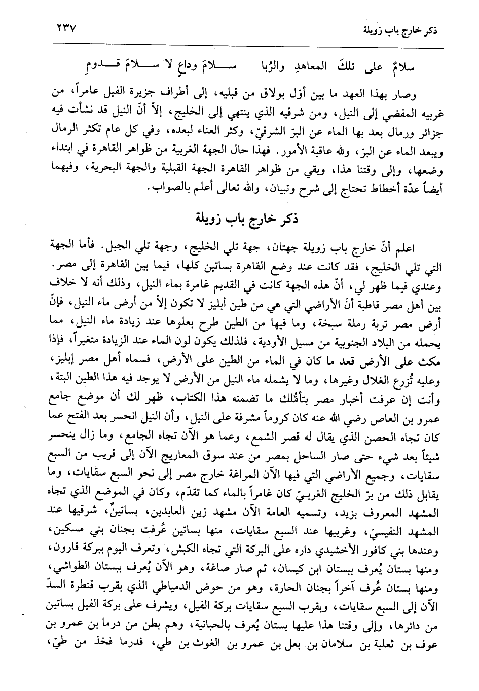 وعندي فيما ظهر لي، أنّ هذه الجهة كانت في القديم غامرة بماء النيل، وذلك أنه لا خلاف بين أهل مصر قاطبة أنّ الأراضي التي هي من طين أبليز لا تكون إلّا من أرض ماء النيل، فإنّ أرض مصر تربة رملة سبخة، وما فيها من الطين طرح بعلوها عند زيادة ماء النيل، مما يحمله من البلاد الجنوبية من مسيل الأودية، فلذلك يكون لون الماء عند الزيادة متغيرا، فإذا مكث على الأرض قعد ما كان في الماء من الطين على الأرض، فسماه أهل مصر إبليز، وعليه تزرع الغلال وغيرها، وما لا يشمله ماء النيل من الأرض لا يوجد فيه هذا الطين البتة، وأنت إن عرفت أخبار مصر بتأمّلك ما تضمنه هذا الكتاب، ظهر لك أن موضع جامع عمرو بن العاص رضي الله عنه كان كروما مشرفة على النيل، وأن النيل انحسر بعد الفتح عما كان تجاه الحصن الذي يقال له قصر الشمع، وعما هو الآن تجاه الجامع، وما زال ينحسر شيئا بعد شيء حتى صار الساحل بمصر من عند سوق المعاريج الآن إلى قريب من السبع سقايات، وجميع الأراضي التي فيها الآن المراغة خارج مصر إلى نحو السبع سقايات، وما يقابل ذلك من برّ الخليج الغربيّ كان غامرا بالماء كما تقدّم، وكان في الموضع الذي تجاه المشهد المعروف بزيد، وتسميه العامة الآن مشهد زين العابدين، بساتين، شرقيها عند المشهد النفيسيّ، وغربيها عند السبع سقايات، منها بساتين عرفت بجنان بني مسكين، وعندها بني كافور الإخشيدي داره على البركة التي تجاه الكبش، وتعرف اليوم ببركة قارون، ومنها بستان يعرف ببستان ابن كيسان، ثم صار صاغة، وهو الآن يعرف ببستان الطواشي، ومنها بستان عرف آخرا بجنان الحارة، وهو من حوض الدمياطي الذي بقرب قنطرة السدّ الآن إلى السبع سقايات، وبقرب السبع سقايات بركة الفيل، ويشرف على بركة الفيل بساتين من دائرها، وإلى وقتنا هذا عليها بستان يعرف بالحبانية، وهم بطن من درما بن عمرو بن عوف بن ثعلبة بن سلامان بن بعل بن عمرو بن الغوث بن طي، فدرما فخذ من طيّ،