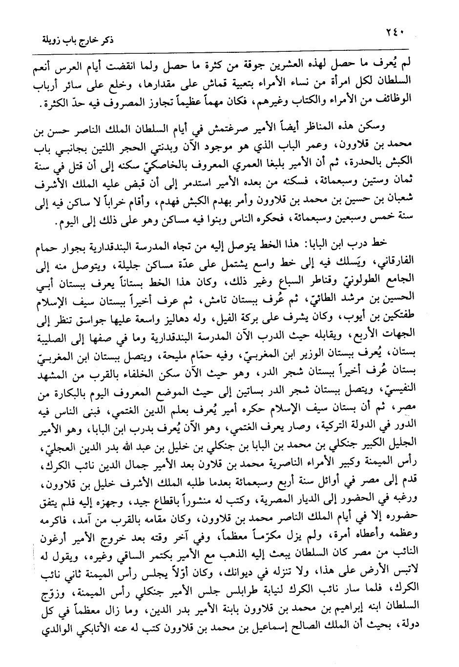 وسكن هذه المناظر أيضا الأمير صرغتمش في أيام السلطان الملك الناصر حسن بن محمد بن قلاوون، وعمر الباب الذي هو موجود الآن وبدنتي الحجر اللتين بجانبي باب الكبش بالحدرة، ثم أن الأمير بلبغا العمري المعروف بالخاصكيّ سكنه إلى أن قتل في سنة ثمان وستين وسبعمائة، فسكنه من بعده الأمير استدمر إلى أن قبض عليه الملك الأشرف شعبان بن حسين بن محمد بن قلاوون وأمر بهدم الكبش فهدم، وأقام خرابا لا ساكن فيه إلى سنة خمس وسبعين وسبعمائة، فحكره الناس وبنوا فيه مساكن وهو على ذلك إلى اليوم.