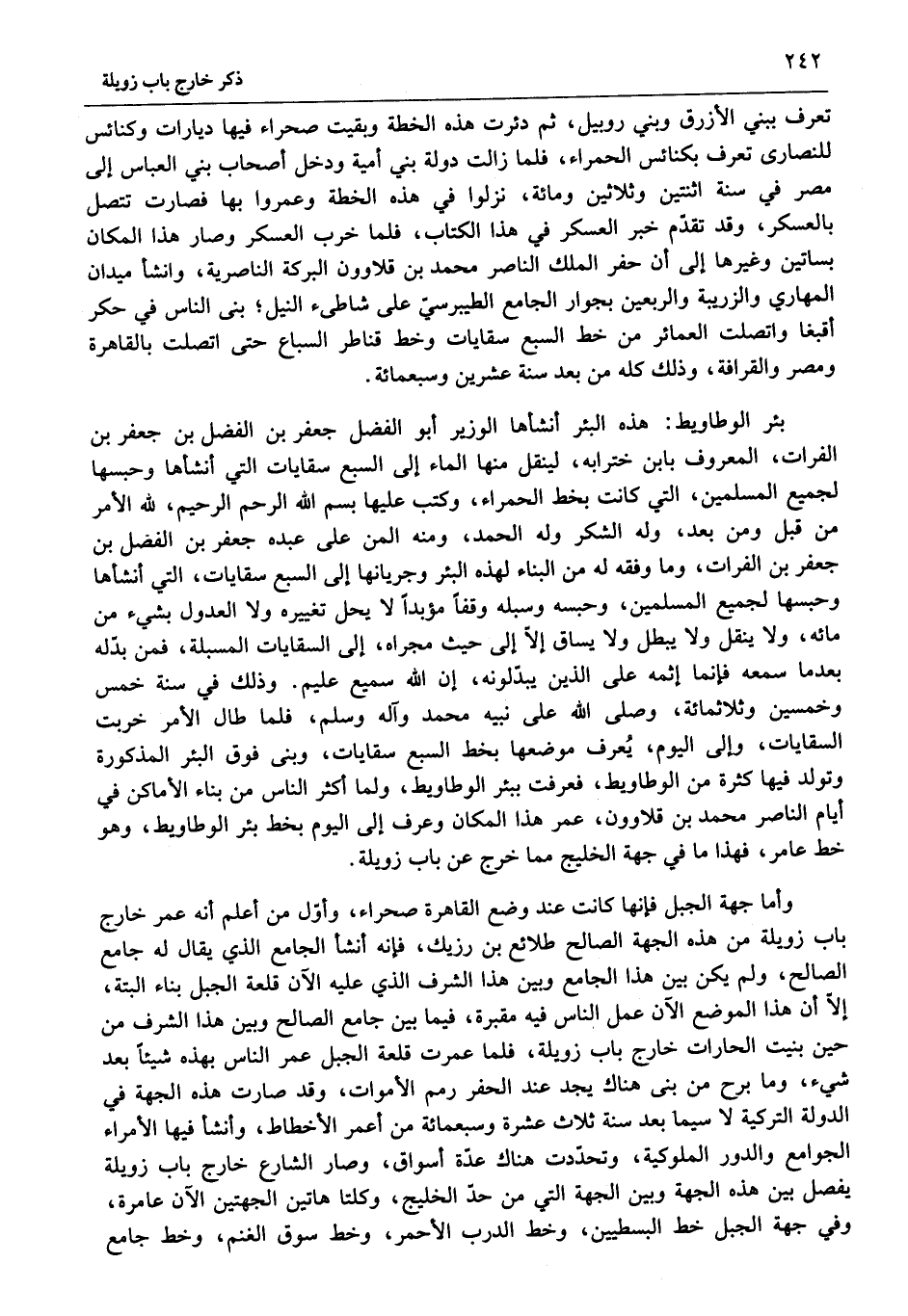 وأما جهة الجبل فإنها كانت عند وضع القاهرة صحراء، وأوّل من أعلم أنه عمر خارج باب زويلة من هذه الجهة الصالح طلائع بن رزيك، فإنه أنشأ الجامع الذي يقال له جامع الصالح، ولم يكن بين هذا الجامع وبين هذا الشرف الذي عليه الآن قلعة الجبل بناء البتة، إلّا أن هذا الموضع الآن عمل الناس فيه مقبرة، فيما بين جامع الصالح وبين هذا الشرف من حين بنيت الحارات خارج باب زويلة، فلما عمرت قلعة الجبل عمر الناس بهذه شيئا بعد شيء، وما برح من بنى هناك يجد عند الحفر رمم الأموات، وقد صارت هذه الجهة في الدولة التركية لا سيما بعد سنة ثلاث عشرة وسبعمائة من أعمر الأخطاط، وأنشأ فيها الأمراء الجوامع والدور الملوكية، وتحدّدت هناك عدّة أسواق، وصار الشارع خارج باب زويلة يفصل بين هذه الجهة وبين الجهة التي من حدّ الخليج، وكلتا هاتين الجهتين الآن عامرة، وفي جهة الجبل خط البسطيين، وخط الدرب الأحمر، وخط سوق الغنم، وخط جامع