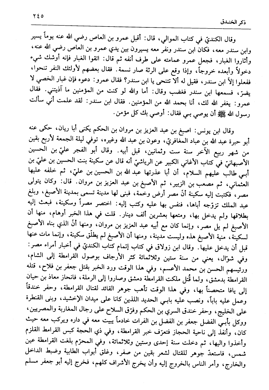وقال ابن يونس: اصبغ بن عبد العزيز بن مروان بن الحكم يكنى أبا ريان، حكى عنه أبو حبرة عبد الله بن عباد المغافريّ، وعون بن عبد الله وغيره، توفي ليلة الجمعة لأربع بقين من شهر ربيع الآخر سنة ست وثمانين، قبل أبيه. وقال أبو الفجر عليّ بن الحسين الأصبهانيّ في كتاب الأغاني الكبير عن الرياشيّ أنه قال عن سكينة بنت الحسين بن عليّ بن أبي طالب عليهم السلام، أن أبا عذرتها عبد الله بن الحسين بن عليّ، ثم خلفه عليها العثماني، ثم مصعب بن الزبير، ثم الأصبغ بن عبد العزيز بن مروان. قال: وكان يتولى مصر، فكتبت إليه سكينة أنّ مصر أرض وخمة، فبنى لها مدينة تسمى بمدينة الأصبغ، وبلغ عبد الملك تزوّجه أباها، فنفس بها عليه وكتب إليه: اختصر مصرا وسكينة، فبعث إليه بطلاقها ولم يدخل بها، ومتعها بعشرين ألف دينار. قلت في هذا الخبر أوهام، منها أن الأصبغ لم يل مصر، وإنما كان مع أبيه عبد العزيز بن مروان، ومنها أنّ الذي بناه الأصبغ لسكينة، منية الأصبغ هذه وليست مدينة، ومنها أن الأصبغ لم يطلّق سكينة، وإنما مات عنها قبل أن يدخل عليها. وقال ابن زولاق في كتاب إتمام كتاب الكنديّ في أخبار أمراء مصر: