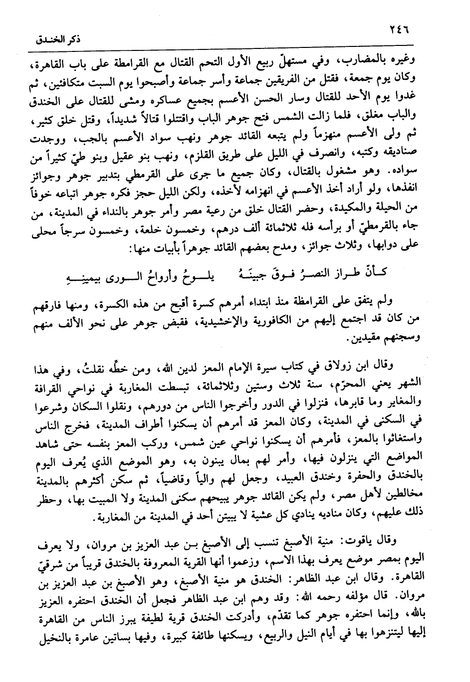 وغيره بالمضارب، وفي مستهلّ ربيع الأول التحم القتال مع القرامطة على باب القاهرة، وكان يوم جمعة، فقتل من الفريقين جماعة وأسر جماعة وأصبحوا يوم السبت متكافئين، ثم غدوا يوم الأحد للقتال وسار الحسن الأعسم بجميع عساكره ومشى للقتال على الخندق والباب مغلق، فلما زالت الشمس فتح جوهر الباب واقتتلوا قتالا شديدا، وقتل خلق كثير، ثم ولى الأعسم منهزما ولم يتبعه القائد جوهر ونهب سواد الأعسم بالجب، ووجدت صناديقه وكتبه، وانصرف في الليل على طريق القلزم، ونهب بنو عقيل وبنو طيّ كثيرا من سواده. وهو مشغول بالقتال، وكان جميع ما جرى على القرمطي بتدبير جوهر وجوائز انفذها، ولو أراد أخذ الأعسم في انهزامه لأخذه، ولكن الليل حجز فكره جوهر اتباعه خوفا من الحيلة والمكيدة، وحضر القتال خلق من رعية مصر وأمر جوهر بالنداء في المدينة، من جاء بالقرمطيّ أو برأسه فله ثلاثمائة ألف درهم، وخمسون خلعة، وخمسون سرجا محلى على دوابها، وثلاث جوائز، ومدح بعضهم القائد جوهرا بأبيات منها:
