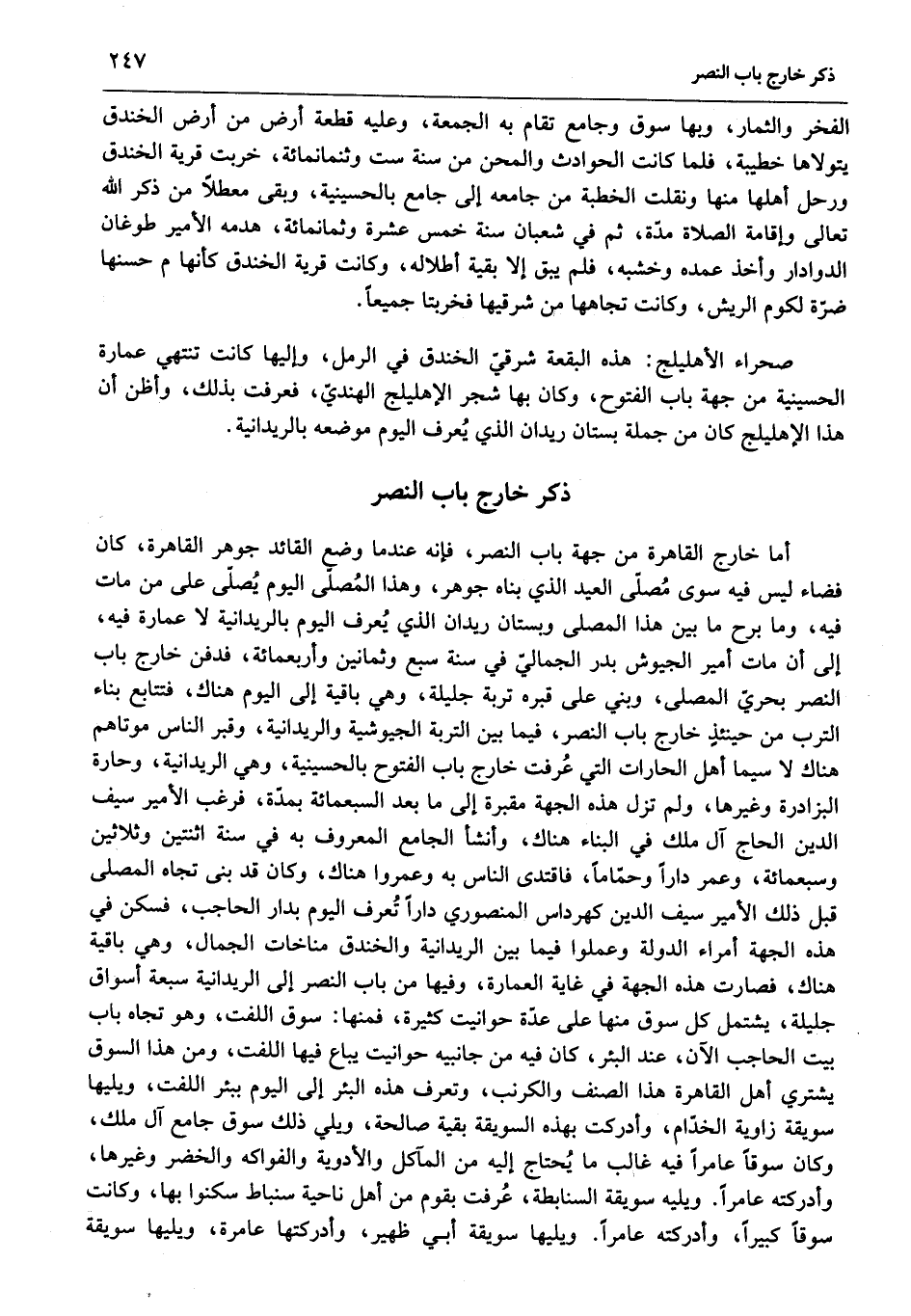 أما خارج القاهرة من جهة باب النصر، فإنه عند ما وضع القائد جوهر القاهرة، كان فضاء ليس فيه سوى مصلّى العيد الذي بناه جوهر، وهذا المصلّى اليوم يصلّى على من مات فيه، وما برح ما بين هذا المصلى وبستان ريدان الذي يعرف اليوم بالريدانية لا عمارة فيه، إلى أن مات أمير الجيوش بدر الجماليّ في سنة سبع وثمانين وأربعمائة، فدفن خارج باب النصر بحريّ المصلى، وبني على قبره تربة جليلة، وهي باقية إلى اليوم هناك، فتتابع بناء الترب من حينئذ خارج باب النصر، فيما بين التربة الجيوشية والريدانية، وقبر الناس موتاهم هناك لا سيما أهل الحارات التي عرفت خارج باب الفتوح بالحسينية، وهي الريدانية، وحارة البزادرة وغيرها، ولم تزل هذه الجهة مقبرة إلى ما بعد السبعمائة بمدّة، فرغب الأمير سيف الدين الحاج آل ملك في البناء هناك، وأنشأ الجامع المعروف به في سنة اثنتين وثلاثين وسبعمائة، وعمر دارا وحمّاما، فاقتدى الناس به وعمروا هناك، وكان قد بنى تجاه المصلى قبل ذلك الأمير سيف الدين كهرداس المنصوري دارا تعرف اليوم بدار الحاجب، فسكن في هذه الجهة أمراء الدولة وعملوا فيما بين الريدانية والخندق مناخات الجمال، وهي باقية هناك، فصارت هذه الجهة في غاية العمارة، وفيها من باب النصر إلى الريدانية سبعة أسواق جليلة، يشتمل كل سوق منها على عدّة حوانيت كثيرة، فمنها: سوق اللفت، وهو تجاه باب بيت الحاجب الآن، عند البئر، كان فيه من جانبيه حوانيت يباع فيها اللفت، ومن هذا السوق يشتري أهل القاهرة هذا الصنف والكرنب، وتعرف هذه البئر إلى اليوم ببئر اللفت، ويليها سويقة زاوية الخدّام، وأدركت بهذه السويقة بقية صالحة، ويلي ذلك سوق جامع آل ملك، وكان سوقا عامرا فيه غالب ما يحتاج إليه من المآكل والأدوية والفواكه والخضر وغيرها، وأدركته عامرا. ويليه سويقة السنابطة، عرفت بقوم من أهل ناحية سنباط سكنوا بها، وكانت سوقا كبيرا، وأدركته عامرا. ويليها سويقة أبي ظهير، وأدركتها عامرة، ويليها سويقة