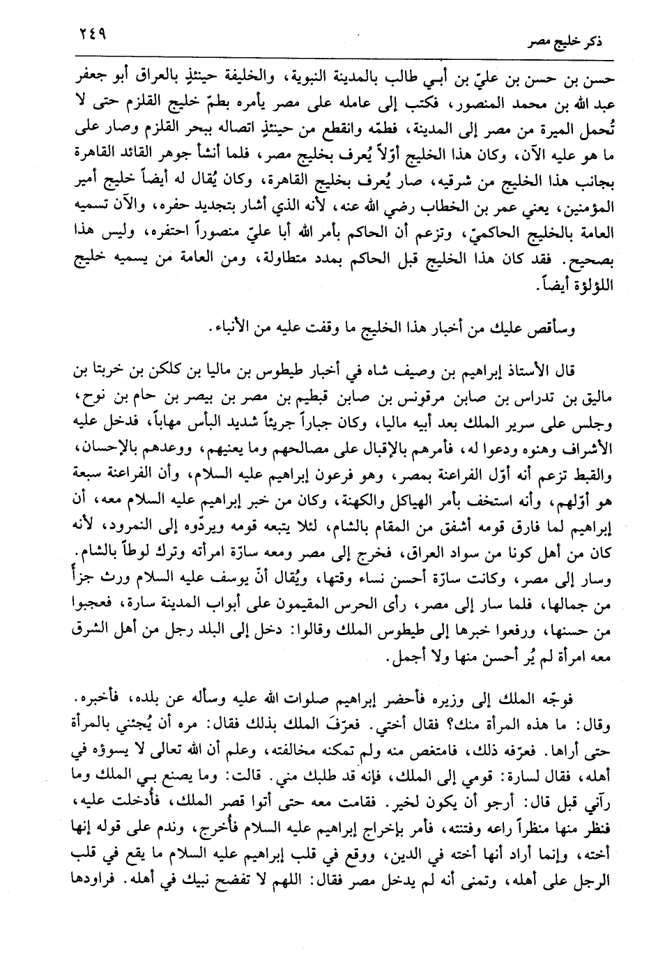 حسن بن حسن بن عليّ بن أبي طالب بالمدينة النبوية، والخليفة حينئذ بالعراق أبو جعفر عبد الله بن محمد المنصور، فكتب إلى عامله على مصر يأمره بطمّ خليج القلزم حتى لا تحمل الميرة من مصر إلى المدينة، فطمّه وانقطع من حينئذ اتصاله ببحر القلزم وصار على ما هو عليه الآن، وكان هذا الخليج أوّلا يعرف بخليج مصر، فلما أنشأ جوهر القائد القاهرة بجانب هذا الخليج من شرقيه، صار يعرف بخليج القاهرة، وكان يقال له أيضا خليج أمير المؤمنين، يعني عمر بن الخطاب رضي الله عنه، لأنه الذي أشار بتجديد حفره، والآن تسميه العامة بالخليج الحاكميّ، وتزعم أن الحاكم بأمر الله أبا عليّ منصورا احتفره، وليس هذا بصحيح. فقد كان هذا الخليج قبل الحاكم بمدد متطاولة، ومن العامة من يسميه خليج اللؤلؤة أيضا.
