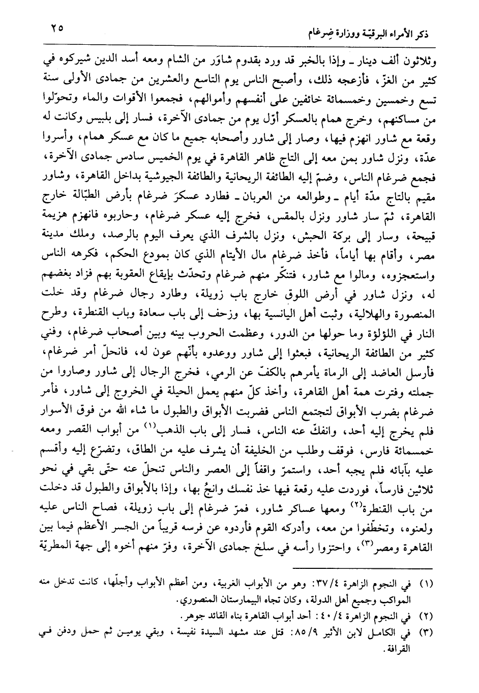 وثلاثون ألف دينار- وإذا بالخبر قد ورد بقدوم شاور من الشام ومعه أسد الدين شير كوه في كثير من الغزّ، فأزعجه ذلك، وأصبح الناس يوم التاسع والعشرين من جمادى الأولى سنة تسع وخمسين وخمسمائة خائفين على أنفسهم وأموالهم، فجمعوا الأقوات والماء وتحوّلوا من مساكنهم، وخرج همام بالعسكر أوّل يوم من جمادى الآخرة، فسار إلى بلبيس وكانت له وقعة مع شاور انهزم فيها، وصار إلى شاور وأصحابه جميع ما كان مع عسكر همام، وأسروا عدّة، ونزل شاور بمن معه إلى التاج ظاهر القاهرة في يوم الخميس سادس جمادى الآخرة، فجمع ضرغام الناس، وضمّ إليه الطائفة الريحانية والطائفة الجيوشية بداخل القاهرة، وشاور مقيم بالتاج مدّة أيام- وطوالعه من العربان- فطارد عسكر ضرغام بأرض الطبّالة خارج القاهرة، ثمّ سار شاور ونزل بالمقس، فخرج إليه عسكر ضرغام، وحاربوه فانهزم هزيمة قبيحة، وسار إلى بركة الحبش، ونزل بالشرف الذي يعرف اليوم بالرصد، وملك مدينة مصر، وأقام بها أياما، فأخذ ضرغام مال الأيتام الذي كان بمودع الحكم، فكرهه الناس واستعجزوه، ومالوا مع شاور، فتنكّر منهم ضرغام وتحدّث بإيقاع العقوبة بهم فزاد بغضهم له، ونزل شاور في أرض اللوق خارج باب زويلة، وطارد رجال ضرغام وقد خلت المنصورة والهلالية، وثبت أهل اليانسية بها، وزحف إلى باب سعادة وباب القنطرة، وطرح النار في اللؤلؤة وما حولها من الدور، وعظمت الحروب بينه وبين أصحاب ضرغام، وفني كثير من الطائفة الريحانية، فبعثوا إلى شاور ووعدوه بأنّهم عون له، فانحلّ أمر ضرغام، فأرسل العاضد إلى الرماة يأمرهم بالكفّ عن الرمي، فخرج الرجال إلى شاور وصاروا من جملته وفترت همة أهل القاهرة، وأخذ كلّ منهم يعمل الحيلة في الخروج إلى شاور، فأمر ضرغام بضرب الأبواق لتجتمع الناس فضربت الأبواق والطبول ما شاء الله من فوق الأسوار فلم يخرج إليه أحد، وانفكّ عنه الناس، فسار إلى باب الذهب «1» من أبواب القصر ومعه خمسمائة فارس، فوقف وطلب من الخليفة أن يشرف عليه من الطاق، وتضرّع إليه وأقسم عليه بآبائه فلم يجبه أحد، واستمرّ واقفا إلى العصر والناس تنحلّ عنه حتّى بقي في نحو ثلاثين فارسا، فوردت عليه رقعة فيها خذ نفسك وانج بها، وإذا بالأبواق والطبول قد دخلت من باب القنطرة «2» ومعها عساكر شاور، فمرّ ضرغام إلى باب زويلة، فصاح الناس عليه ولعنوه، وتخطّفوا من معه، وأدركه القوم فأردوه عن فرسه قريبا من الجسر الأعظم فيما بين القاهرة ومصر «3» ، واحتزوا رأسه في سلخ جمادى الآخرة، وفرّ منهم أخوه إلى جهة المطريّة