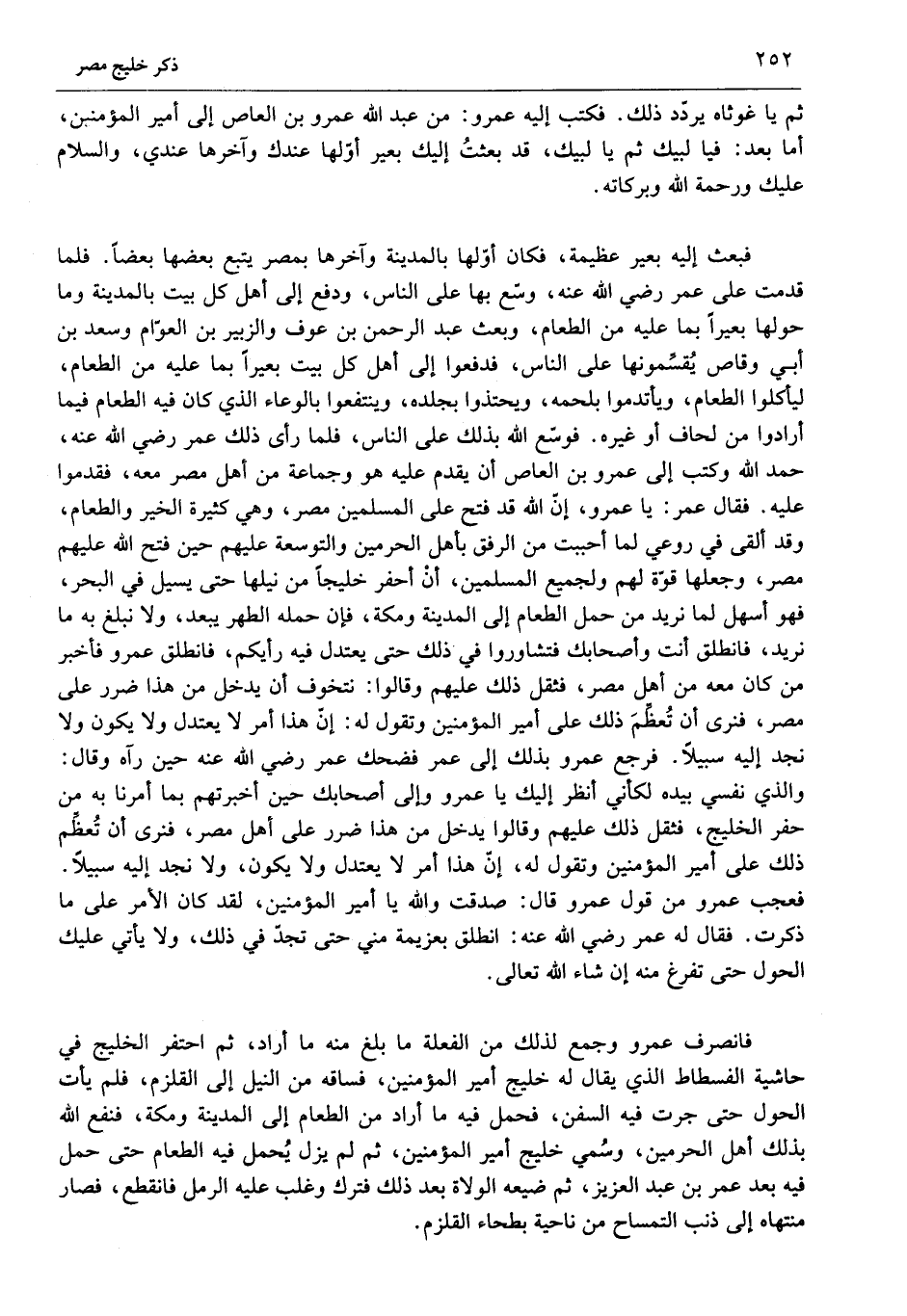 فبعث إليه بعير عظيمة، فكان أوّلها بالمدينة وآخرها بمصر يتبع بعضها بعضا. فلما قدمت على عمر رضي الله عنه، وسّع بها على الناس، ودفع إلى أهل كل بيت بالمدينة وما حولها بعيرا بما عليه من الطعام، وبعث عبد الرحمن بن عوف والزبير بن العوّام وسعد بن أبي وقاص يقسّمونها على الناس، فدفعوا إلى أهل كل بيت بعيرا بما عليه من الطعام، ليأكلوا الطعام، ويأتدموا بلحمه، ويحتذوا بجلده، وينتفعوا بالوعاء الذي كان فيه الطعام فيما أرادوا من لحاف أو غيره. فوسّع الله بذلك على الناس، فلما رأى ذلك عمر رضي الله عنه، حمد الله وكتب إلى عمرو بن العاص أن يقدم عليه هو وجماعة من أهل مصر معه، فقدموا عليه. فقال عمر: يا عمرو، إنّ الله قد فتح على المسلمين مصر، وهي كثيرة الخير والطعام، وقد ألقى في روعي لما أحببت من الرفق بأهل الحرمين والتوسعة عليهم حين فتح الله عليهم مصر، وجعلها قوّة لهم ولجميع المسلمين، أن أحفر خليجا من نيلها حتى يسيل في البحر، فهو أسهل لما نريد من حمل الطعام إلى المدينة ومكة، فإن حمله الطهر يبعد، ولا نبلغ به ما نريد، فانطلق أنت وأصحابك فتشاوروا في ذلك حتى يعتدل فيه رأيكم، فانطلق عمرو فأخبر من كان معه من أهل مصر، فثقل ذلك عليهم وقالوا: نتخوف أن يدخل من هذا ضرر على مصر، فنرى أن تعظّم ذلك على أمير المؤمنين وتقول له: إنّ هذا أمر لا يعتدل ولا يكون ولا نجد إليه سبيلا. فرجع عمرو بذلك إلى عمر فضحك عمر رضي الله عنه حين رآه وقال: