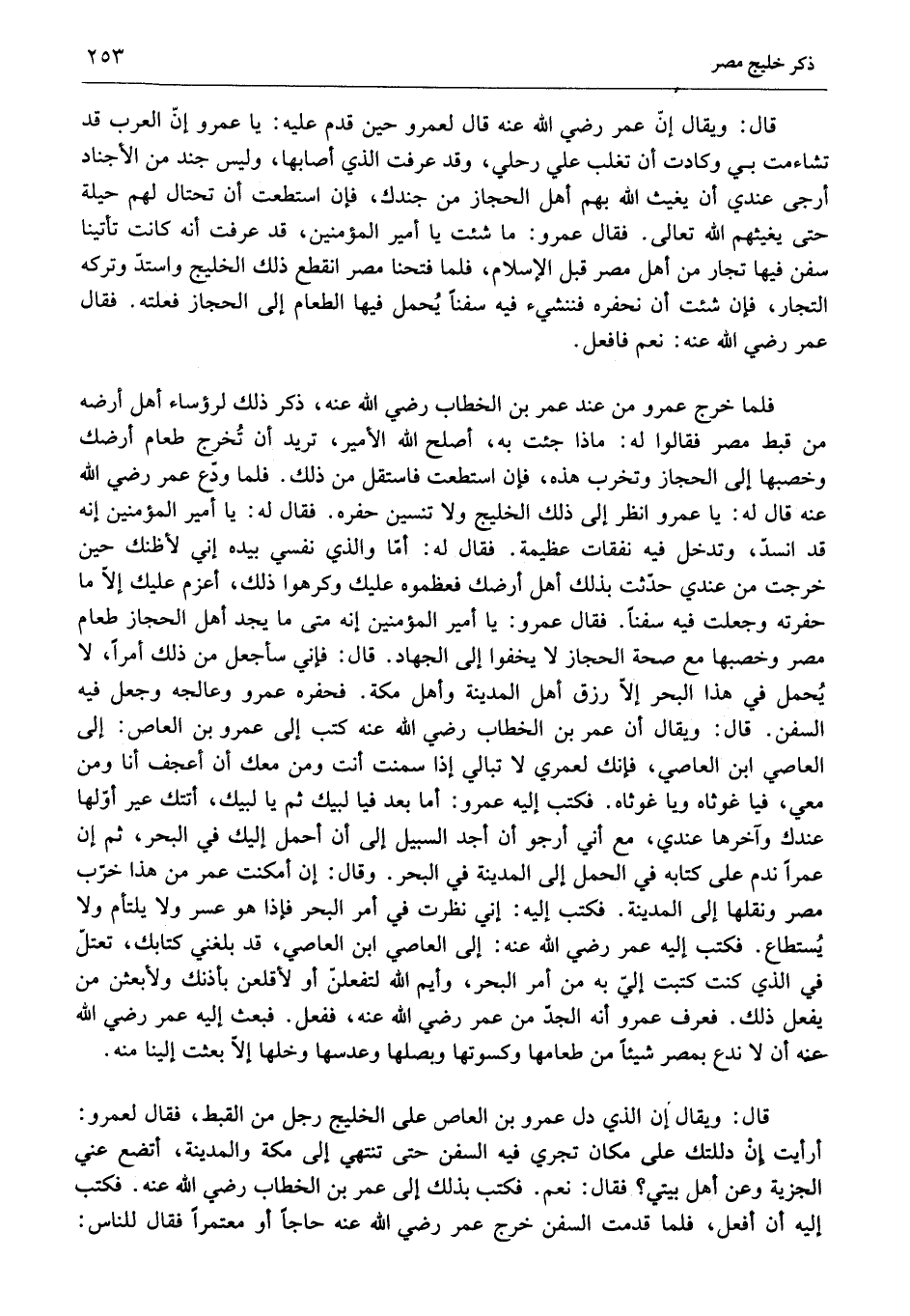 فلما خرج عمرو من عند عمر بن الخطاب رضي الله عنه، ذكر ذلك لرؤساء أهل أرضه من قبط مصر فقالوا له: ماذا جئت به، أصلح الله الأمير، تريد أن تخرج طعام أرضك وخصبها إلى الحجاز وتخرب هذه، فإن استطعت فاستقل من ذلك. فلما ودّع عمر رضي الله عنه قال له: يا عمرو انظر إلى ذلك الخليج ولا تنسين حفره. فقال له: يا أمير المؤمنين إنه قد انسدّ، وتدخل فيه نفقات عظيمة. فقال له: أمّا والذي نفسي بيده إني لأظنك حين خرجت من عندي حدّثت بذلك أهل أرضك فعظموه عليك وكرهوا ذلك، أعزم عليك إلّا ما حفرته وجعلت فيه سفنا. فقال عمرو: يا أمير المؤمنين إنه متى ما يجد أهل الحجاز طعام مصر وخصبها مع صحة الحجاز لا يخفوا إلى الجهاد. قال: فإني سأجعل من ذلك أمرا، لا يحمل في هذا البحر إلّا رزق أهل المدينة وأهل مكة. فحفره عمرو وعالجه وجعل فيه السفن. قال: ويقال أن عمر بن الخطاب رضي الله عنه كتب إلى عمرو بن العاص: إلى العاصي ابن العاصي، فإنك لعمري لا تبالي إذا سمنت أنت ومن معك أن أعجف أنا ومن معي، فيا غوثاه ويا غوثاه. فكتب إليه عمرو: أما بعد فيا لبيك ثم يا لبيك، أتتك عير أوّلها عندك وآخرها عندي، مع أني أرجو أن أجد السبيل إلى أن أحمل إليك في البحر، ثم إن عمرا ندم على كتابه في الحمل إلى المدينة في البحر. وقال: إن أمكنت عمر من هذا خرّب مصر ونقلها إلى المدينة. فكتب إليه: إني نظرت في أمر البحر فإذا هو عسر ولا يلتأم ولا يستطاع. فكتب إليه عمر رضي الله عنه: إلى العاصي ابن العاصي، قد بلغني كتابك، تعتلّ في الذي كنت كتبت إليّ به من أمر البحر، وأيم الله لتفعلنّ أو لأقلعن بأذنك ولأبعثن من يفعل ذلك. فعرف عمرو أنه الجدّ من عمر رضي الله عنه، ففعل. فبعث إليه عمر رضي الله عنه أن لا ندع بمصر شيئا من طعامها وكسوتها وبصلها وعدسها وخلها إلّا بعثت إلينا منه.