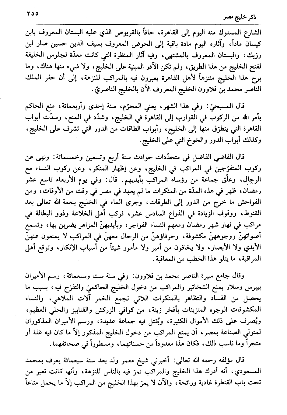 قال مؤلفه رحمه الله تعالى: أخبرني شيخ معمر ولد بعد سنة سبعمائة يعرف بمحمد المسعودي، أنه أدرك هذا الخليج والمراكب تمرّ فيه بالناس للنزهة، وأنها كانت تعبر من تحت باب القنطرة غادية ورائحة، والآن لا يمرّ بهذا الخليج من المراكب إلّا ما يحمل متاعا