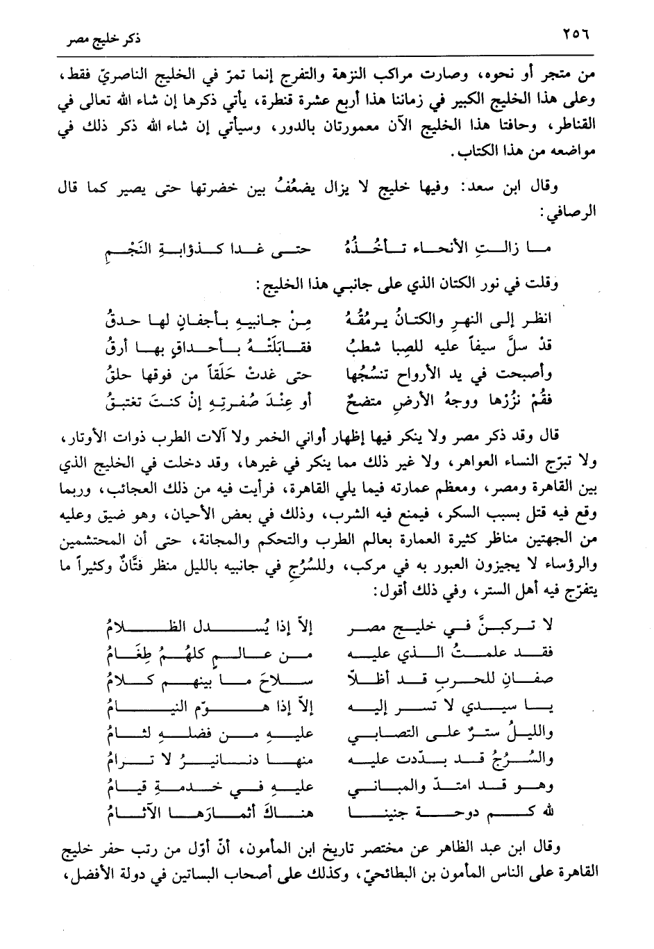 قال وقد ذكر مصر ولا ينكر فيها إظهار أواني الخمر ولا آلات الطرب ذوات الأوتار، ولا تبرّج النساء العواهر، ولا غير ذلك مما ينكر في غيرها، وقد دخلت في الخليج الذي بين القاهرة ومصر، ومعظم عمارته فيما يلي القاهرة، فرأيت فيه من ذلك العجائب، وربما وقع فيه قتل بسبب السكر، فيمنع فيه الشرب، وذلك في بعض الأحيان، وهو ضيق وعليه من الجهتين مناظر كثيرة العمارة بعالم الطرب والتحكم والمجانة، حتى أن المحتشمين والرؤساء لا يجيزون العبور به في مركب، وللسرج في جانبيه بالليل منظر فتّان وكثيرا ما يتفرّج فيه أهل الستر، وفي ذلك أقول: