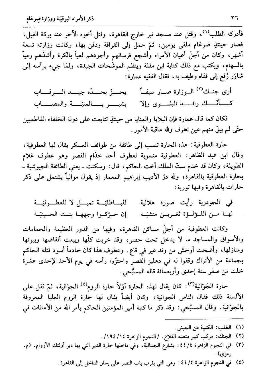 وكانت العطوفية من أجلّ مساكن القاهرة، وفيها من الدور العظيمة والحمامات والأسواق والمساجد ما لا يدخل تحت حصر، وقد خربت كلّها وبيعت أنقاضها وبيوتها ومنازلها، وأضحت أوحش من وتدعير في قاع. وعطوف هذا كان خادما أسود قتله الحاكم بجماعة من الأتراك وقفوا له في دهليز القصر واحتزّوا رأسه في يوم الأحد لإحدى عشرة خلت من صفر سنة إحدى وأربعمائة قاله المسبّحي.
