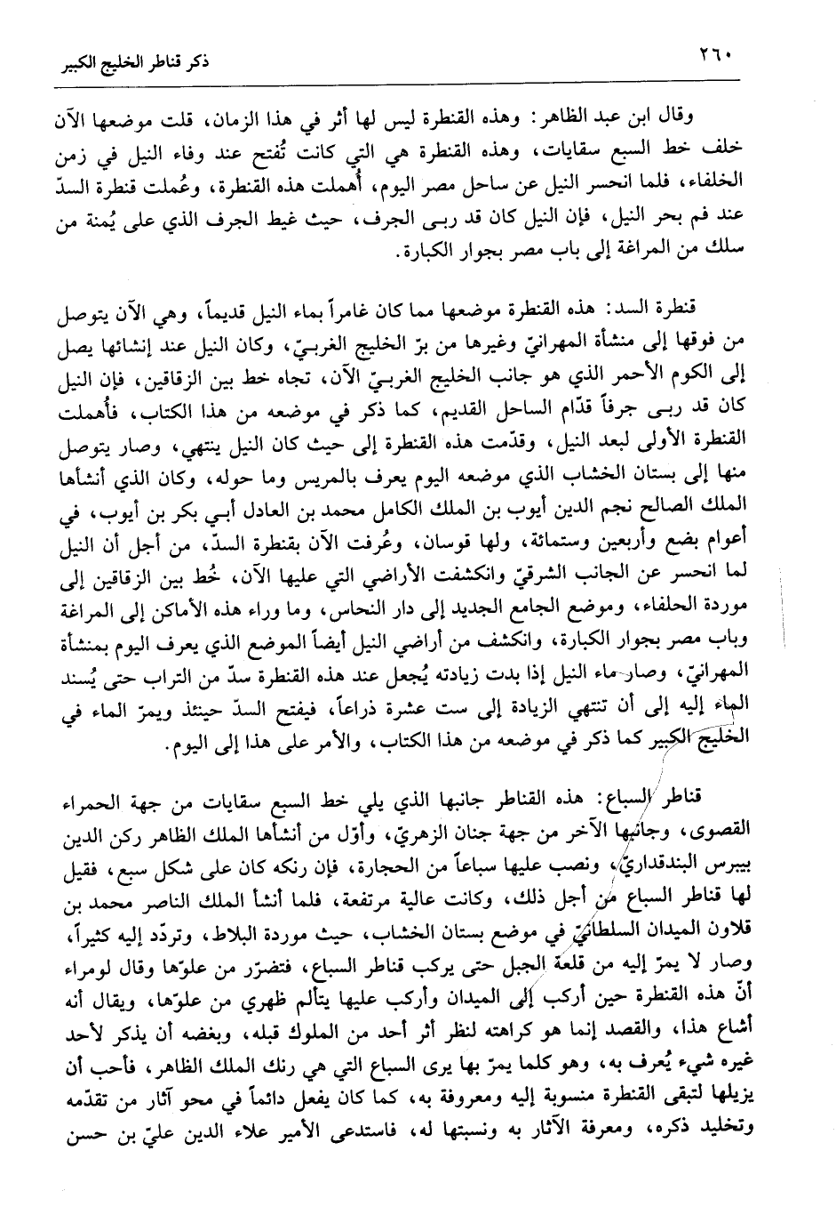 قنطرة السد: هذه القنطرة موضعها مما كان غامرا بماء النيل قديما، وهي الآن يتوصل من فوقها إلى منشأة المهرانيّ وغيرها من برّ الخليج الغربيّ، وكان النيل عند إنشائها يصل إلى الكوم الأحمر الذي هو جانب الخليج الغربيّ الآن، تجاه خط بين الزقاقين، فإن النيل كان قد ربى جرفا قدّام الساحل القديم، كما ذكر في موضعه من هذا الكتاب، فأهملت القنطرة الأولى لبعد النيل، وقدّمت هذه القنطرة إلى حيث كان النيل ينتهي، وصار يتوصل منها إلى بستان الخشاب الذي موضعه اليوم يعرف بالمريس وما حوله، وكان الذي أنشأها الملك الصالح نجم الدين أيوب بن الملك الكامل محمد بن العادل أبي بكر بن أيوب، في أعوام بضع وأربعين وستمائة، ولها قوسان، وعرفت الآن بقنطرة السدّ، من أجل أن النيل لما انحسر عن الجانب الشرقيّ وانكشفت الأراضي التي عليها الآن، خط بين الزقاقين إلى موردة الحلفاء، وموضع الجامع الجديد إلى دار النحاس، وما وراء هذه الأماكن إلى المراغة وباب مصر بجوار الكبارة، وانكشف من أراضي النيل أيضا الموضع الذي يعرف اليوم بمنشأة المهرانيّ، وصار ماء النيل إذا بدت زيادته يجعل عند هذه القنطرة سدّ من التراب حتى يسند الماء إليه إلى أن تنتهي الزيادة إلى ست عشرة ذراعا، فيفتح السدّ حينئذ ويمرّ الماء في الخليج الكبير كما ذكر في موضعه من هذا الكتاب، والأمر على هذا إلى اليوم.