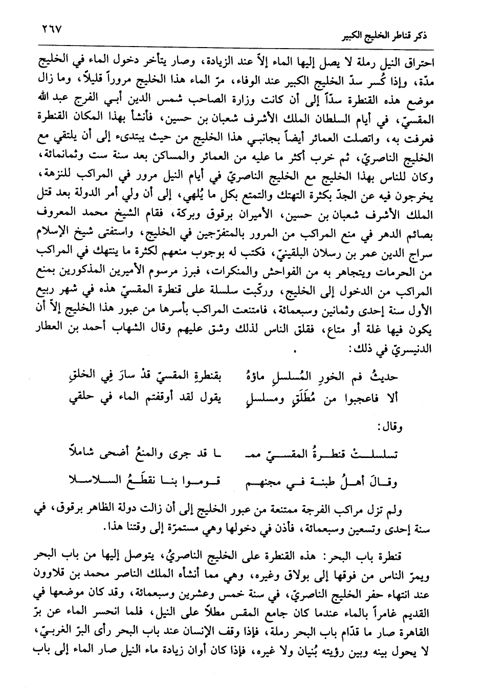 احتراق النيل رملة لا يصل إليها الماء إلّا عند الزيادة، وصار يتأخر دخول الماء في الخليج مدّة، وإذا كسر سدّ الخليج الكبير عند الوفاء، مرّ الماء هذا الخليج مرورا قليلا، وما زال موضع هذه القنطرة سدّا إلى أن كانت وزارة الصاحب شمس الدين أبي الفرج عبد الله المقسيّ، في أيام السلطان الملك الأشرف شعبان بن حسين، فأنشأ بهذا المكان القنطرة فعرفت به، واتصلت العمائر أيضا بجانبي هذا الخليج من حيث يبتدئ إلى أن يلتقي مع الخليج الناصريّ، ثم خرب أكثر ما عليه من العمائر والمساكن بعد سنة ست وثمانمائة، وكان للناس بهذا الخليج مع الخليج الناصريّ في أيام النيل مرور في المراكب للنزهة، يخرجون فيه عن الجدّ بكثرة التهتك والتمتع بكل ما يلهي، إلى أن ولي أمر الدولة بعد قتل الملك الأشرف شعبان بن حسين، الأميران برقوق وبركة، فقام الشيخ محمد المعروف بصائم الدهر في منع المراكب من المرور بالمتفرّجين في الخليج، واستفتى شيخ الإسلام سراج الدين عمر بن رسلان البلقينيّ، فكتب له بوجوب منعهم لكثرة ما ينتهك في المراكب من الحرمات ويتجاهر به من الفواحش والمنكرات، فبرز مرسوم الأميرين المذكورين بمنع المراكب من الدخول إلى الخليج، وركّبت سلسلة على قنطرة المقسيّ هذه في شهر ربيع الأول سنة إحدى وثمانين وسبعمائة، فامتنعت المراكب بأسرها من عبور هذا الخليج إلّا أن يكون فيها غلة أو متاع، فقلق الناس لذلك وشق عليهم وقال الشهاب أحمد بن العطار الدنيسريّ في ذلك: