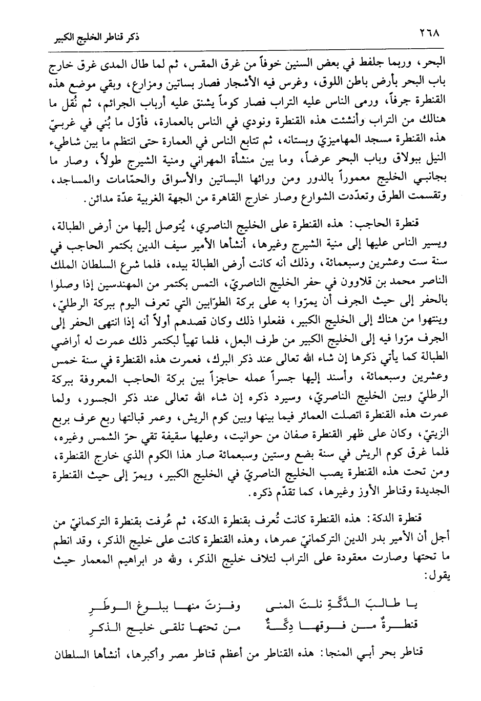 البحر، وربما جلفط في بعض السنين خوفا من غرق المقس، ثم لما طال المدى غرق خارج باب البحر بأرض باطن اللوق، وغرس فيه الأشجار فصار بساتين ومزارع، وبقي موضع هذه القنطرة جرفا، ورمى الناس عليه التراب فصار كوما يشنق عليه أرباب الجرائم، ثم نقل ما هنالك من التراب وأنشئت هذه القنطرة ونودي في الناس بالعمارة، فأوّل ما بني في غربيّ هذه القنطرة مسجد المهاميزيّ وبستانه، ثم تتابع الناس في العمارة حتى انتظم ما بين شاطيء النيل ببولاق وباب البحر عرضا، وما بين منشأة المهراني ومنية الشيرج طولا، وصار ما بجانبي الخليج معمورا بالدور ومن ورائها البساتين والأسواق والحمّامات والمساجد، وتقسمت الطرق وتعدّدت الشوارع وصار خارج القاهرة من الجهة الغربية عدّة مدائن.