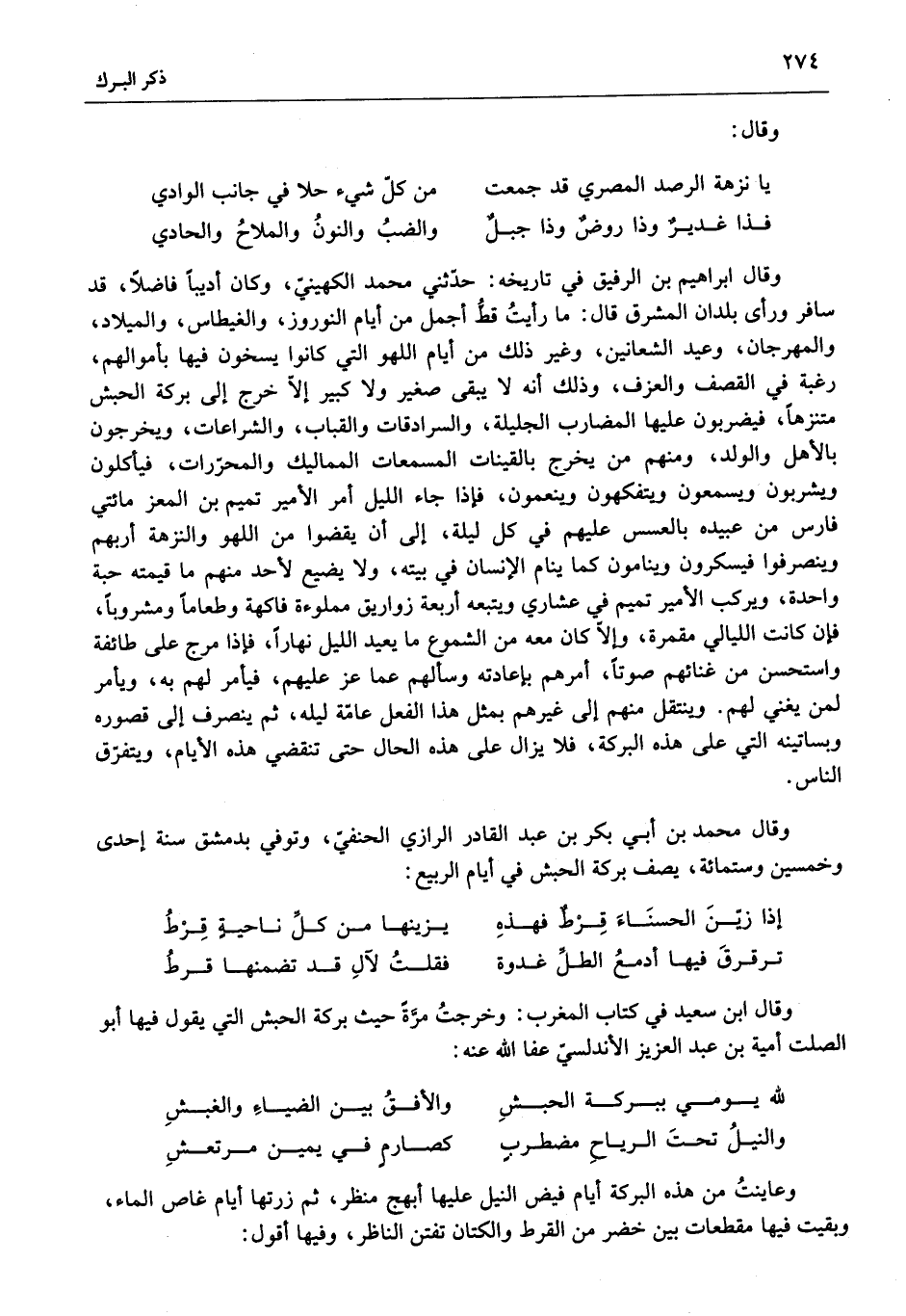 وعاينت من هذه البركة أيام فيض النيل عليها أبهج منظر، ثم زرتها أيام غاص الماء، وبقيت فيها مقطعات بين خضر من القرط والكتان تفتن الناظر، وفيها أقول: