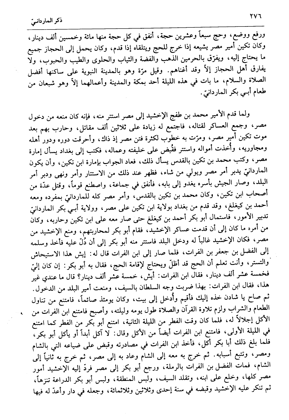 ولما قدم الأمير محمد بن طفج الإخشيد إلى مصر استتر منه، فإنه كان منعه من دخول مصر، وجمع العساكر لقتاله، فاجتمع له زيادة على ثلاثين ألف مقاتل، وحارب بهم بعد موت تكين أمير مصر، ومرّت به خطوب لكثرة فتن مصر إذ ذاك، وأحرقت دوره ودور أهله ومجاوريه، وأخذت أمواله واستتر فقبض على خليفته وعماله، فكتب إلى بغداد يسأل إمارة مصر، وكتب محمد بن تكين بالقدس يسأل ذلك، فعاد الجواب بإمارة ابن تكين، وأن يكون الماردانيّ يدبر أمر مصر ويولي من شاء، فظهر عند ذلك من الاستتار وأمر ونهى ودبر أمر البلد، وصار الجيش بأسره يغدو إلى بابه، فأنفق في جماعة، واصطنع قوما، وقتل عدّة من أصحاب ابن تكين، وكان محمد بن تكين بالقدس، وأمر مصر كله للماردانيّ بمفرده ومعه أحمد بن كيغلغ، وقد قدم من بغداد بولاية ابن تكين على مصر، وولاية أبي بكر الماردانيّ تدبير الأمور، فاستمال أبو بكر أحمد بن كيغلغ حتى صار معه على ابن تكين وحاربه، وكان من أمره ما كان إلى أن قدمت عساكر الإخشيد، فقام أبو بكر لمحاربتهم، ومنع الإخشيد من مصر، فكان الإخشيد غالبا له ودخل البلد فاستتر منه أبو بكر إلى أن دلّ عليه فأخذ وسلمه إلى الفضل بن جعفر بن الفرات، فلما صار إلى ابن الفرات قال له: إيش هذا الاستيحاش والتستر، وأنت تعلم أن الحج قد أظلّ ويحتاج لإقامة الحج، فقال به أبو بكر: إن كان إليّ فخمسة عشر ألف دينار، فقال ابن الفرات: أيش، خمسة عشر ألف دينار؟ قال ما عندي غير هذا، فقال ابن الفرات: بهذا ضربت وجه السلطان بالسيف، ومنعت أمير البلد من الدخول.