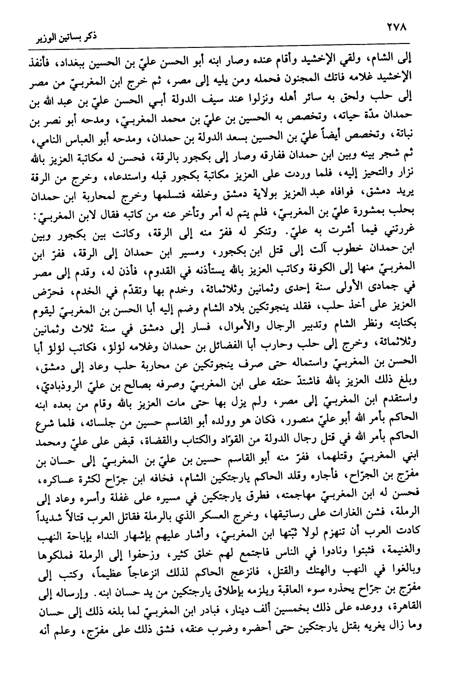 غررتني فيما أشرت به عليّ. وتنكر له ففرّ منه إلى الرقة، وكانت بين بكجور وبين ابن حمدان خطوب آلت إلى قتل ابن بكجور، ومسير ابن حمدان إلى الرقة، ففرّ ابن المغربيّ منها إلى الكوفة وكاتب العزيز بالله يستأذنه في القدوم، فأذن له، وقدم إلى مصر في جمادى الأولى سنة إحدى وثمانين وثلاثمائة، وخدم بها وتقدّم في الخدم، فحرّض العزيز على أخذ حلب، فقلد ينجوتكين بلاد الشام وضم إليه أبا الحسن بن المغربيّ ليقوم بكتابته ونظر الشام وتدبير الرجال والأموال، فسار إلى دمشق في سنة ثلاث وثمانين وثلاثمائة، وخرج إلى حلب وحارب أبا الفضائل بن حمدان وغلامه لؤلؤ، فكاتب لؤلؤ أبا الحسن بن المغربيّ واستماله حتى صرف ينجوتكين عن محاربة حلب وعاد إلى دمشق، وبلغ ذلك العزيز بالله فاشتدّ حنقه على ابن المغربيّ وصرفه بصالح بن عليّ الروذباديّ، واستقدم ابن المغربيّ إلى مصر، ولم يزل بها حتى مات العزيز بالله وقام من بعده ابنه الحاكم بأمر الله أبو عليّ منصور، فكان هو وولده أبو القاسم حسين من جلسائه، فلما شرع الحاكم بأمر الله في قتل رجال الدولة من القوّاد والكتاب والقضاة، قبض على عليّ ومحمد ابني المغربيّ وقتلهما، ففرّ منه أبو القاسم حسين بن عليّ بن المغربيّ إلى حسان بن مفرّج بن الجرّاح، فأجاره وقلد الحاكم يارجتكين الشام، فخافه ابن جرّاح لكثرة عساكره، فحسن له ابن المغربيّ مهاجمته، فطرق يارجتكين في مسيره على غفلة وأسره وعاد إلى الرملة، فشن الغارات على رساتيقها، وخرج العسكر الذي بالرملة فقاتل العرب قتالا شديدا كادت العرب أن تنهزم لولا ثبّتها ابن المغربيّ، وأشار عليهم بإشهار النداء بإباحة النهب والغنيمة، فثبتوا ونادوا في الناس فاجتمع لهم خلق كثير، وزحفوا إلى الرملة فملكوها وبالغوا في النهب والهتك والقتل، فانزعج الحاكم لذلك انزعاجا عظيما، وكتب إلى مفرّج بن جرّاح يحذره سوء العاقبة ويلزمه بإطلاق يارجتكين من يد حسان ابنه. وإرساله إلى القاهرة، ووعده على ذلك بخمسين ألف دينار، فبادر ابن المغربيّ لما بلغه ذلك إلى حسان وما زال يغريه بقتل يارجتكين حتى أحضره وضرب عنقه، فشق ذلك على مفرّج، وعلم أنه