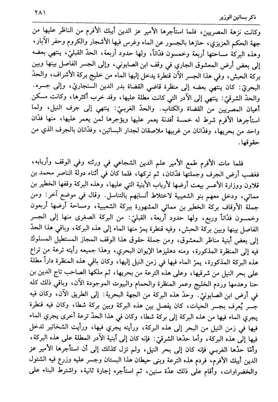 فلما مات الأفرم طمع الأمير علم الدين الشجاعي في ورثته وفي الوقف وأربابه، فغضب أرض الجرف وجملتها فدّانان، ثم تركها، فلما كان في أثناء دولة الناصر محمد بن قلاون ووزارة الأعسر بيعت أرضها لأرباب الأبنية التي عليها، وهذه البركة وقفها الخطير بن مماتي، ودخل معهم بنو الشعيبية لاختلاط أنسابهم بالتناسل. وقال في موضع آخر: ومن جملة الأوقاف بركة الخطير بن مماتي المشهورة ببركة الشعيبية، ومساحة أرضها أربعون وخمسون فدّانا وربع، ولها حدود أربعة، القبليّ: من البركة الصغرى منها إلى الجسر الفاصل بينها وبين بركة الحبش، وفيه قنطرة يمرّ منها الماء إلى هذه البركة، وباقي هذا الحدّ إلى بعض أبنية مناظر المعشوق، ومن جملة حقوق هذا الوقف المجاز المستطيل المسلوك فيه إلى المنظرة المذكورة، ومنه دهليزها الإيوان البحري، وهذا جميعه رأيته ترعة من تراع هذه البركة المذكورة، يمرّ الماء فيها في زمن النيل إليها، وكان باقي هذه المنظرة دارا مطلة على بحر النيل من شرقيها، وعلى هذه الترعة من بحريها، ثم ملكها الصاحب تاج الدين بن حنا وهدمها وردم الخليج وعمر المنظرة والحمام والبيوت الموجودة الآن، وباقي ذلك كله في أرض ابن الصابونيّ. وحدّ هذه البركة من الجهة البحرية: إلى الطريق الآن، وكان فيه جسر يعرف بجسر الحيات، كان يفصل بين هذه البركة وبين بركة شطا، وكان فيه قنطرة يجري الماء فيها من هذه البركة إلى بركة شطا، وكان في هذا الحدّ ترعة أخرى يجري الماء فيها في زمن النيل من البحر إلى هذه البركة، ورأيته يجري فيها، ورأيت الشخاتير تدخل فيها إلى هذه البركة، وأما حدّها الشرقيّ: فإنه كان إلى أبنية الآدر المطلة على هذه البركة، وأمّا حدّها الغربي فإنه كان إلى بحر النيل، ولم تزل كذلك إلى أن استأجرها الأمير عز الدين أيبك الأفرم، فردم هذه الترعة وبنى حيطان هذا البستان وجسر عليه وزرع فيه الشتول والخضراوات، وأقام على ذلك عدّة سنين، ثم استأجره إجارة ثانية، واشترط البناء على