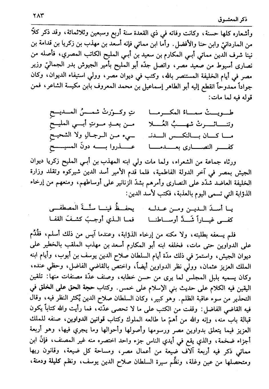 وأشعاره كلها حسنة، وكانت وفاته في ذي القعدة سنة أربع وسبعين وثلاثمائة، وقد ذكر كلا من الماردانيّ وابن حنا والأفضل. وأما ابن مماتي فإنه أسعد بن مهذب بن زكريا بن قدامة بن نينا شرف الدين مماتي أبي المكارم بن سعيد بن أبي المليح الكاتب المصري، فأصله من نصارى أسيوط من صعيد مصر، واتصل جدّه أبو المليح بأمير الجيوش بدر الجماليّ وزير مصر في أيام الخليفة المستنصر بالله، وكتب في ديوان مصر، وولي استيفاء الديوان، وكان جوادا ممدوحا انقطع إليه أبو الطاهر إسماعيل بن محمد المعروف بابن مكيسة الشاعر، فمن قوله فيه لما مات: