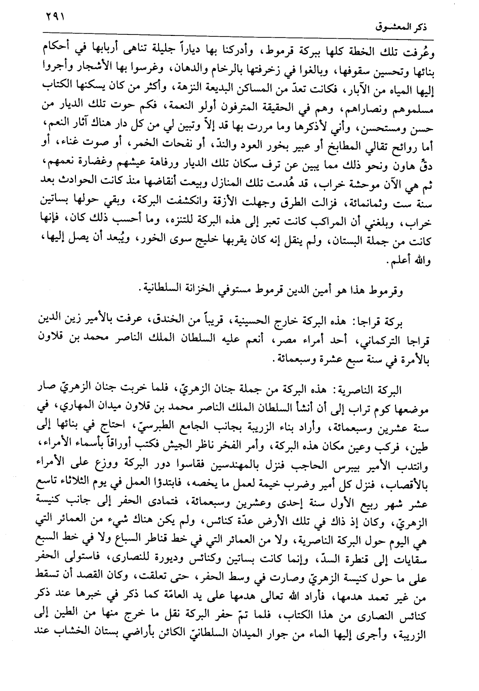 البركة الناصرية: هذه البركة من جملة جنان الزهريّ، فلما خربت جنان الزهريّ صار موضعها كوم تراب إلى أن أنشأ السلطان الملك الناصر محمد بن قلاون ميدان المهاري، في سنة عشرين وسبعمائة، وأراد بناء الزريبة بجانب الجامع الطبرسيّ، احتاج في بنائها إلى طين، فركب وعين مكان هذه البركة، وأمر الفخر ناظر الجيش فكتب أوراقا بأسماء الأمراء، وانتدب الأمير بيبرس الحاجب فنزل بالمهندسين فقاسوا دور البركة ووزع على الأمراء بالأقصاب، فنزل كل أمير وضرب خيمة لعمل ما يخصه، فابتدؤا العمل في يوم الثلاثاء تاسع عشر شهر ربيع الأول سنة إحدى وعشرين وسبعمائة، فتمادى الحفر إلى جانب كنيسة الزهريّ، وكان إذ ذاك في تلك الأرض عدّة كنائس، ولم يكن هناك شيء من العمائر التي هي اليوم حول البركة الناصرية، ولا من العمائر التي في خط قناطر السباع ولا في خط السبع سقايات إلى قنطرة السدّ، وإنما كانت بساتين وكنائس وديورة للنصارى، فاستولى الحفر على ما حول كنيسة الزهريّ وصارت في وسط الحفر، حتى تعلقت، وكان القصد أن تسقط من غير تعمد هدمها، فأراد الله تعالى هدمها على يد العامّة كما ذكر في خبرها عند ذكر كنائس النصارى من هذا الكتاب، فلما تمّ حفر البركة نقل ما خرج منها من الطين إلى الزريبة، وأجرى إليها الماء من جوار الميدان السلطانيّ الكائن بأراضي بستان الخشاب عند