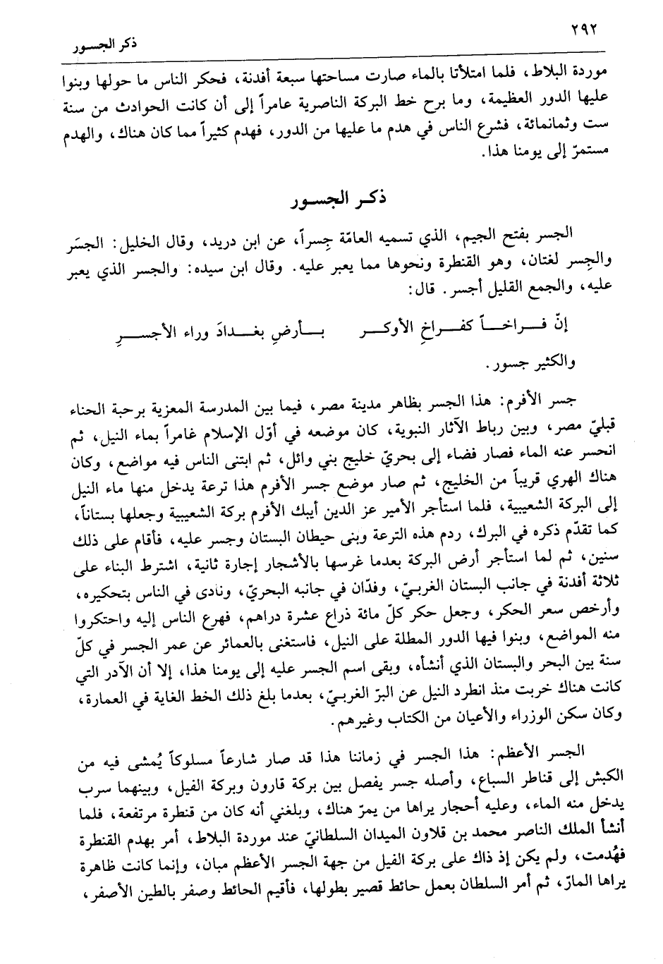 الجسر الأعظم: هذا الجسر في زماننا هذا قد صار شارعا مسلوكا يمشى فيه من الكبش إلى قناطر السباع، وأصله جسر يفصل بين بركة قارون وبركة الفيل، وبينهما سرب يدخل منه الماء، وعليه أحجار يراها من يمرّ هناك، وبلغني أنه كان من قنطرة مرتفعة، فلما أنشأ الملك الناصر محمد بن قلاون الميدان السلطانيّ عند موردة البلاط، أمر بهدم القنطرة فهدمت، ولم يكن إذ ذاك على بركة الفيل من جهة الجسر الأعظم مبان، وإنما كانت ظاهرة يراها المارّ، ثم أمر السلطان بعمل حائط قصير بطولها، فأقيم الحائط وصفر بالطين الأصفر،