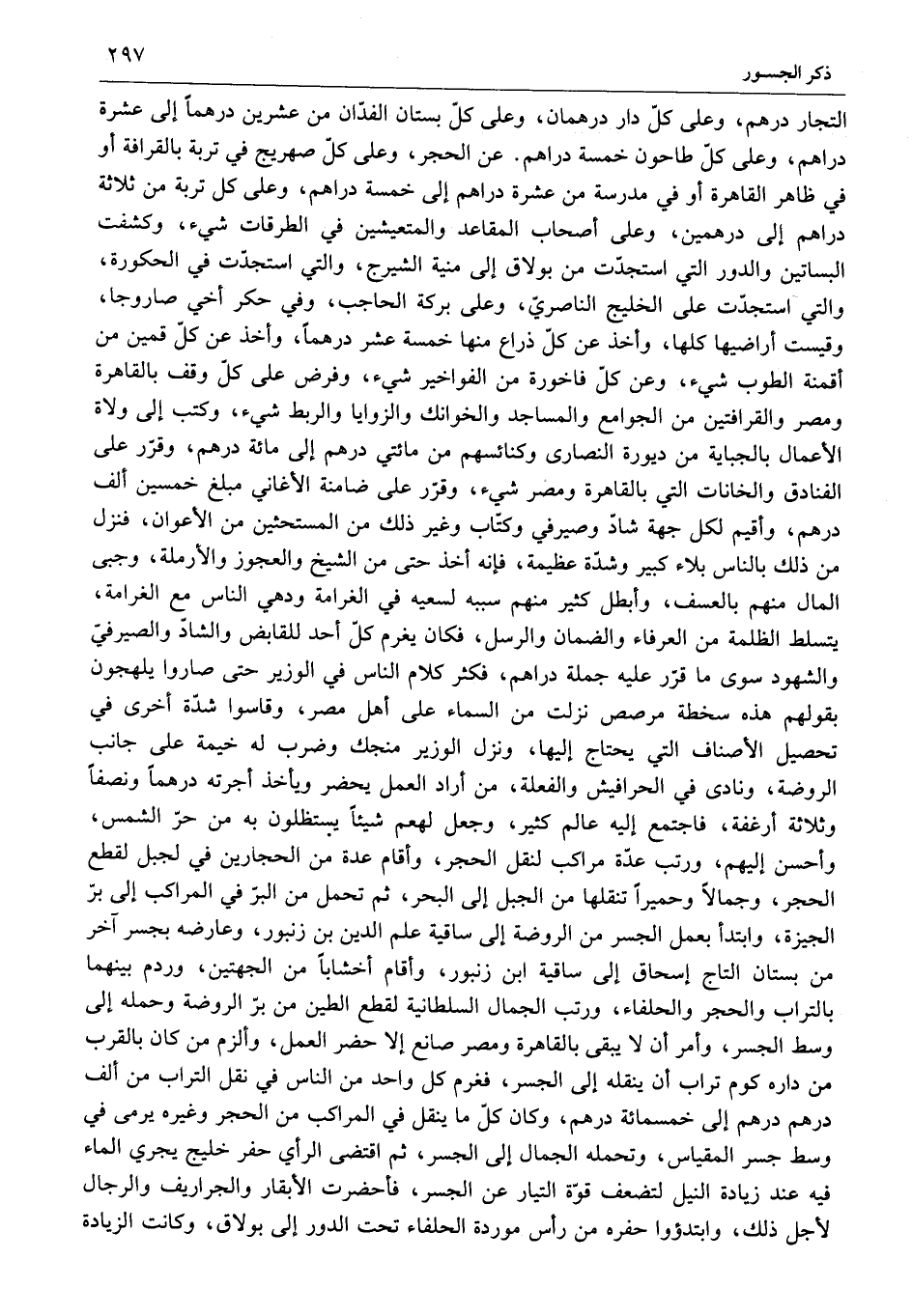 التجار درهم، وعلى كلّ دار در همان، وعلى كلّ بستان الفدّان من عشرين درهما إلى عشرة دراهم، وعلى كلّ طاحون خمسة دراهم. عن الحجر، وعلى كلّ صهريج في تربة بالقرافة أو في ظاهر القاهرة أو في مدرسة من عشرة دراهم إلى خمسة دراهم، وعلى كل تربة من ثلاثة دراهم إلى در همين، وعلى أصحاب المقاعد والمتعيشين في الطرقات شيء، وكشفت البساتين والدور التي استجدّت من بولاق إلى منية الشيرج، والتي استجدّت في الحكورة، والتي استجدّت على الخليج الناصريّ، وعلى بركة الحاجب، وفي حكر أخي صاروجا، وقيست أراضيها كلها، وأخذ عن كلّ ذراع منها خمسة عشر درهما، وأخذ عن كلّ قمين من أقمنة الطوب شيء، وعن كلّ فاخورة من الفواخير شيء، وفرض على كلّ وقف بالقاهرة ومصر والقرافتين من الجوامع والمساجد والخوانك والزوايا والربط شيء، وكتب إلى ولاة الأعمال بالجباية من ديورة النصارى وكنائسهم من مائتي درهم إلى مائة درهم، وقرّر على الفنادق والخانات التي بالقاهرة ومصر شيء، وقرّر على ضامنة الأغاني مبلغ خمسين ألف درهم، وأقيم لكل جهة شادّ وصيرفي وكتّاب وغير ذلك من المستحثين من الأعوان، فنزل من ذلك بالناس بلاء كبير وشدّة عظيمة، فإنه أخذ حتى من الشيخ والعجوز والأرملة، وجبى المال منهم بالعسف، وأبطل كثير منهم سببه لسعيه في الغرامة ودهي الناس مع الغرامة، يتسلط الظلمة من العرفاء والضمان والرسل، فكان يغرم كلّ أحد للقابض والشادّ والصيرفيّ والشهود سوى ما قرّر عليه جملة دراهم، فكثر كلام الناس في الوزير حتى صاروا يلهجون بقولهم هذه سخطة مرصص نزلت من السماء على أهل مصر، وقاسوا شدّة أخرى في تحصيل الأصناف التي يحتاج إليها، ونزل الوزير منجك وضرب له خيمة على جانب الروضة، ونادى في الحرافيش والفعلة، من أراد العمل يحضر ويأخذ أجرته درهما ونصفا وثلاثة أرغفة، فاجتمع إليه عالم كثير، وجعل لهم شيئا يستظلون به من حرّ الشمس، وأحسن إليهم، ورتب عدّة مراكب لنقل الحجر، وأقام عدة من الحجارين في لجبل لقطع الحجر، وجمالا وحميرا تنقلها من الجبل إلى البحر، ثم تحمل من البرّ في المراكب إلى برّ الجيزة، وابتدأ بعمل الجسر من الروضة إلى ساقية علم الدين بن زنبور، وعارضه بجسر آخر من بستان التاج إسحاق إلى ساقية ابن زنبور، وأقام أخشابا من الجهتين، وردم بينهما بالتراب والحجر والحلفاء، ورتب الجمال السلطانية لقطع الطين من برّ الروضة وحمله إلى وسط الجسر، وأمر أن لا يبقى بالقاهرة ومصر صانع إلا حضر العمل، وألزم من كان بالقرب من داره كوم تراب أن ينقله إلى الجسر، فغرم كل واحد من الناس في نقل التراب من ألف درهم درهم إلى خمسمائة درهم، وكان كلّ ما ينقل في المراكب من الحجر وغيره يرمى في وسط جسر المقياس، وتحمله الجمال إلى الجسر، ثم اقتضى الرأي حفر خليج يجري الماء فيه عند زيادة النيل لتضعف قوّة التيار عن الجسر، فأحضرت الأبقار والجراريف والرجال لأجل ذلك، وابتدؤوا حفره من رأس موردة الحلفاء تحت الدور إلى بولاق، وكانت الزيادة