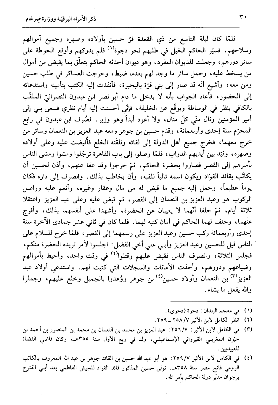فلمّا كان ليلة التاسع من ذي القعدة فرّ حسين بأولاده وصهره وجميع أموالهم وسلاحهم، فسيّر الحاكم الخيل في طلبهم نحو دجوة «1» فلم يدركهم وأوقع الحوطة على سائر دورهم، وجعلت للديوان المفرد، وهو ديوان أحدثه الحاكم يتعلّق بما يقبض من أموال من يسخط عليه، وحمل سائر ما وجد لهم بعد ما ضبط، وخرجت العساكر في طلب حسين ومن معه، وأشيع أنّه قد صار إلى بني قرّة بالبحيرة، فأنفدت إليه الكتب بتأمينه واستدعائه إلى الحضور، فأعاد الجواب بأنه لا يدخل ما دام أبو نصر ابن عبدون النصرانيّ الملقّب بالكافي ينظر في الوساطة ويوقّع عن الخليفة، فإنّي أحسنت إليه أيام نظري فسعى بي إلى أمير المؤمنين ونال منّي كلّ منال، ولا أعود أبدا وهو وزير. فصرف ابن عبدون في رابع المحرّم سنة إحدى وأربعمائة، وقدم حسين بن جوهر ومعه عبد العزيز بن النعمان وسائر من خرج معهما، فخرج جميع أهل الدولة إلى لقائه وتلقّته الخلع فأفيضت عليه وعلى أولاده وصهره، وقيّد بين أيديهم الدواب، فلمّا وصلوا إلى باب القاهرة ترجّلوا ومشوا ومشى الناس بأسرهم إلى القصر فصاروا بحضرة الحاكم، ثمّ خرجوا وقد عفا عنهم، وأذن لحسين أن يكاتب بقائد القوّاد ويكون اسمه تاليا للقبه، وأن يخاطب بذلك. وانصرف إلى داره فكان يوما عظيما، وحمل إليه جميع ما قبض له من مال وعقار وغيره، وأنعم عليه وواصل الركوب هو وعبد العزيز بن النعمان إلى القصر، ثم قبض عليه وعلى عبد العزيز واعتقلا ثلاثة أيام، ثمّ حلفا أنّهما لا يغيبان عن الحضرة، وأشهدا على أنفسهما بذلك، وأفرج عنهما، وحلف لهما الحاكم في أمان كتبه لهما. فلما كان في ثاني عشر جمادى الآخرة سنة إحدى وأربعمائة ركب حسين وعبد العزيز على رسمهما إلى القصر، فلمّا خرج للسلام على الناس قيل للحسين وعبد العزيز وأبي علي أخي الفضل: اجلسوا لأمر تريده الحضرة منكم، فجلس الثلاثة، وانصرف الناس فقبض عليهم وقتلوا «2» في وقت واحد، وأحيط بأموالهم وضياعهم ودورهم، وأخذت الأمانات والسجلات التي كتبت لهم. واستدعي أولاد عبد العزيز «3» بن النعمان وأولاد حسين «4» بن جوهر ووعدوا بالجميل وخلع عليهم، وجملوا والله يفعل ما يشاء.