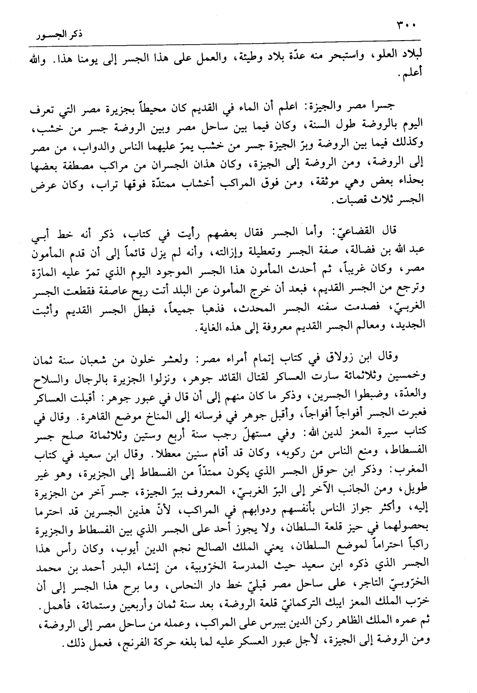 جسرا مصر والجيزة: اعلم أن الماء في القديم كان محيطا بجزيرة مصر التي تعرف اليوم بالروضة طول السنة، وكان فيما بين ساحل مصر وبين الروضة جسر من خشب، وكذلك فيما بين الروضة وبرّ الجيزة جسر من خشب يمرّ عليهما الناس والدواب، من مصر إلى الروضة، ومن الروضة إلى الجيزة، وكان هذان الجسران من مراكب مصطفة بعضها بحذاء بعض وهي موثقة، ومن فوق المراكب أخشاب ممتدّة فوقها تراب، وكان عرض الجسر ثلاث قصبات.