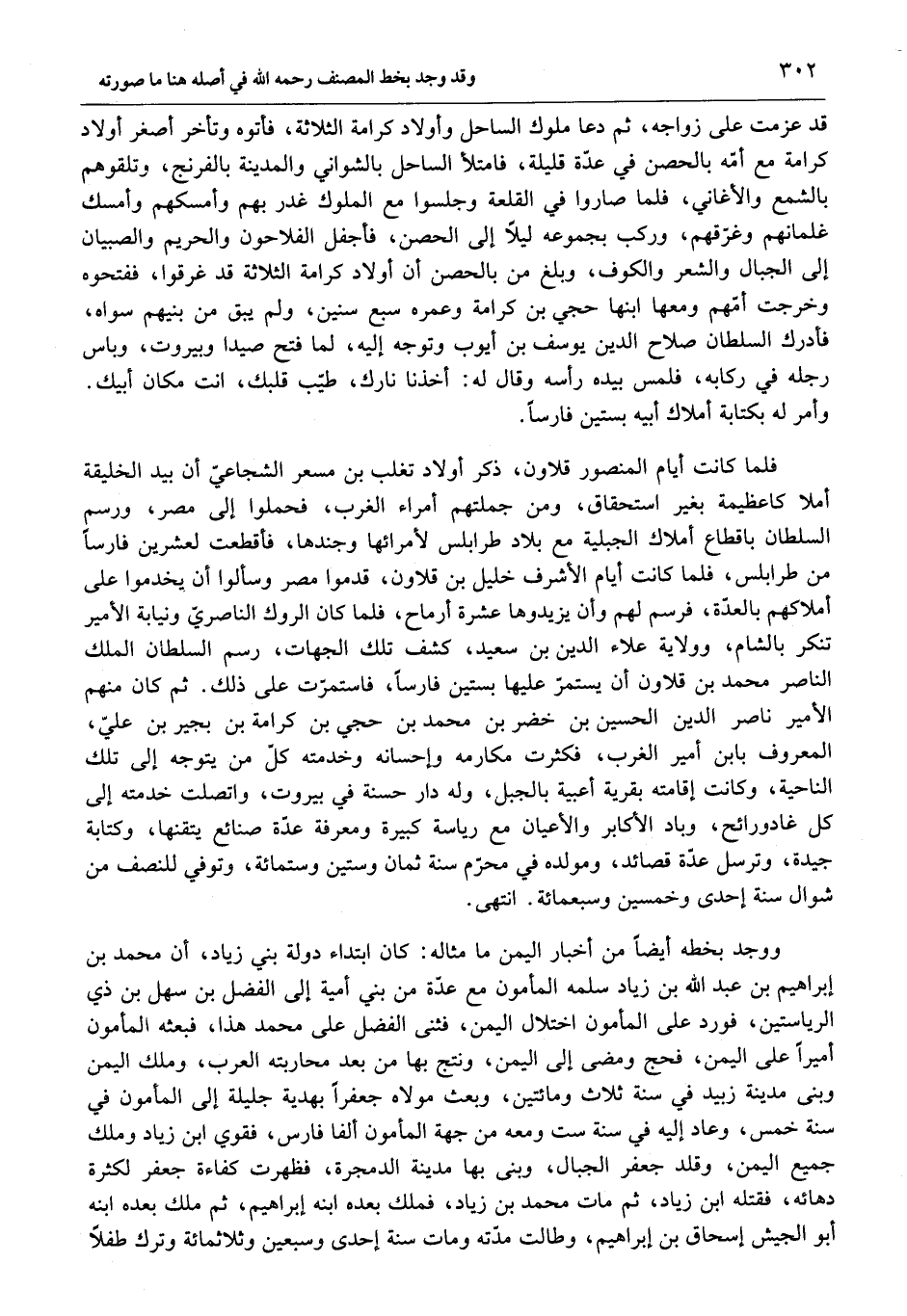ووجد بخطه أيضا من أخبار اليمن ما مثاله: كان ابتداء دولة بني زياد، أن محمد بن إبراهيم بن عبد الله بن زياد سلمه المأمون مع عدّة من بني أمية إلى الفضل بن سهل بن ذي الرياستين، فورد على المأمون اختلال اليمن، فثنى الفضل على محمد هذا، فبعثه المأمون أميرا على اليمن، فحج ومضى إلى اليمن، ونتج بها من بعد محاربته العرب، وملك اليمن وبنى مدينة زبيد في سنة ثلاث ومائتين، وبعث مولاه جعفرا بهدية جليلة إلى المأمون في سنة خمس، وعاد إليه في سنة ست ومعه من جهة المأمون ألفا فارس، فقوي ابن زياد وملك جميع اليمن، وقلد جعفر الجبال، وبنى بها مدينة الدمجرة، فظهرت كفاءة جعفر لكثرة دهائه، فقتله ابن زياد، ثم مات محمد بن زياد، فملك بعده ابنه إبراهيم، ثم ملك بعده ابنه أبو الجيش إسحاق بن إبراهيم، وطالت مدّته ومات سنة إحدى وسبعين وثلاثمائة وترك طفلا