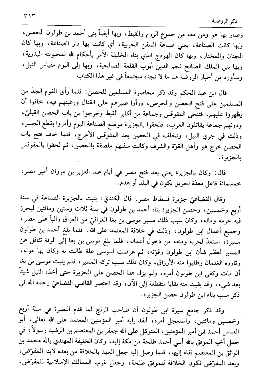 وصار بها هو ومن معه من جموع الروم والقبط، وبها أيضا بنى أحمد بن طولون الحصن، وبها كانت الصناعة، يعني صناعة السفن الحربية، أي كانت بها دار الصناعة، وبها كان الجنان والمختار، وبها كان الهودج الذي بناه الخليفة الآمر بأحكام الله لمحبوبته البدوية، وبها بنى الملك الصالح نجم الدين أيوب القلعة الصالحية، وبها إلى اليوم مقياس النيل، وسأورد من أخبار الروضة هنا ما لا تجده مجتمعا في غير هذا الكتاب.